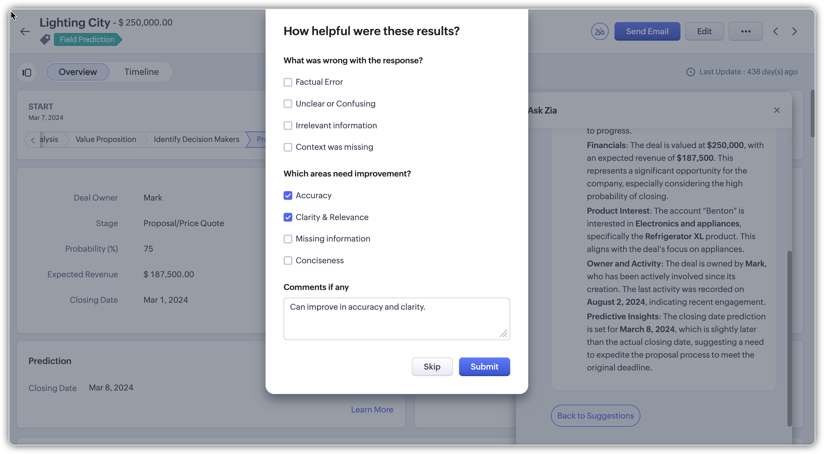 Imaginează-ți acest scenariu: O manageră de vânzări, Priya, primește un apel de escaladare în ultimul moment de la directorul ei cu privire la o tranzacție de mare valoare care este blocată în pipeline. Trebuie să înțeleagă rapid istoricul tranzacției, contactele asociate, activitățile recente și acțiunile în așteptare. Totuși, navigarea prin mai multe file în CRM consumă timp prețios și riscă să piardă detalii esențiale în timpul discuției.