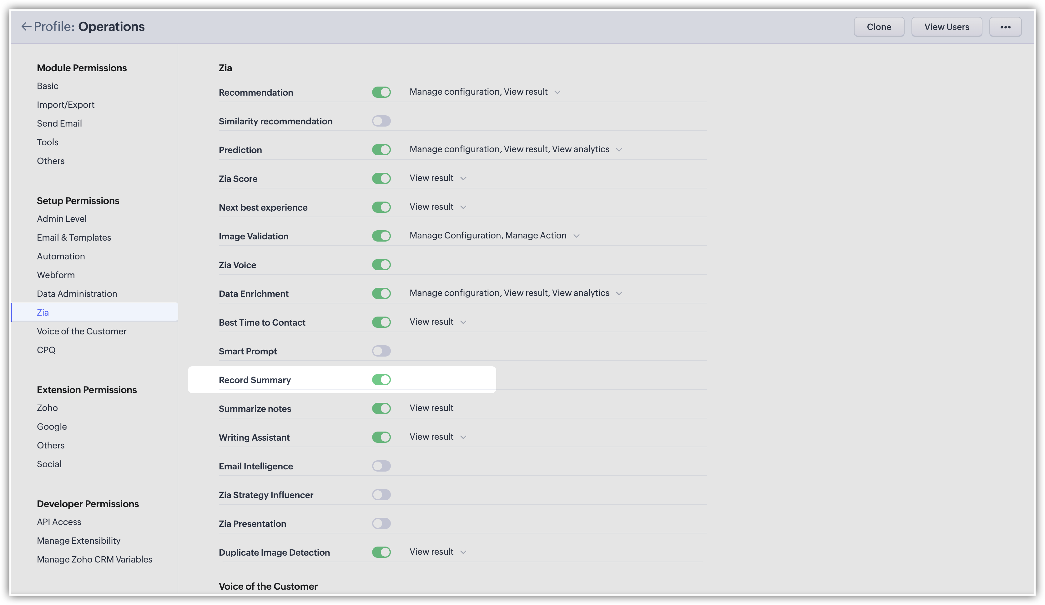 Vei vedea opțiunea Record Summary în panoul Zia Record assistant dacă ai permisiunile necesare.