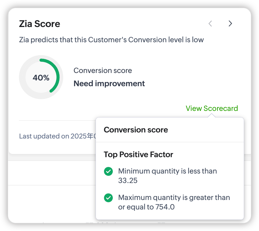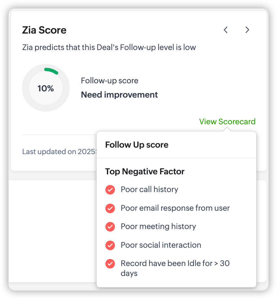 Zia poate lua în considerare datele modulului, datele modulelor asociate, datele activităților asociate și alte informații obținute din SalesSignals și alte funcții integrate cu CRM-ul tău. Zia poate analiza aceste informații pentru a ajunge la un scor care reprezintă sănătatea, implicarea, urmărirea, probabilitatea de conversie și atributul de câmp pentru o anumită înregistrare, facilitând prioritizarea eforturilor și alocarea mai eficientă a resurselor.