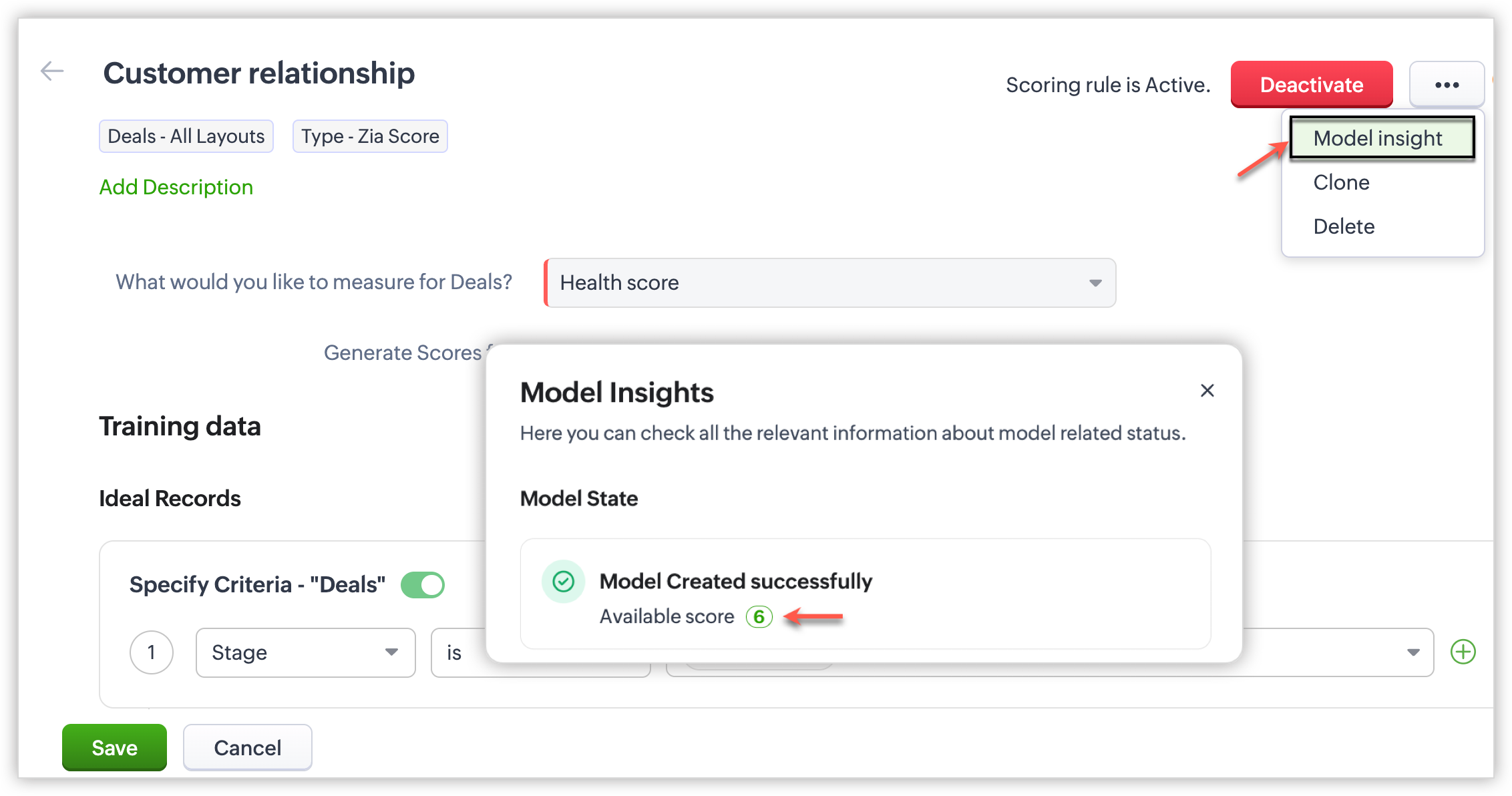 Exemplu: Dacă un utilizator creează Reguli de Punctare pentru modulul Tranzacții și setează criteriile ideale ca Etapa este Tranzacție câștigată și pentru modulul asociat criteriile ideale ca Tranzacții cu Comenzi de Vânzări. Zia ia în considerare toate datele din comanda de vânzări asociată tranzacției ca date de antrenament pentru înregistrările alese. Similar, ar putea lua în considerare toate datele înregistrării, cum ar fi apeluri, emailuri, întâlniri și așa mai departe.