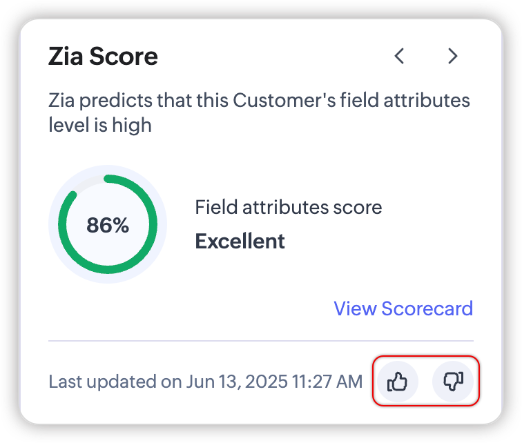 Odată ce ai configurat Scorurile Zia, vei fi notificat când scorurile Zia au fost generate pentru regulă. Un widget dedicat apare pentru a afișa scorurile în pagina individuală de detalii a înregistrării modulului sub un câmp personalizat 'Scor Zia'.