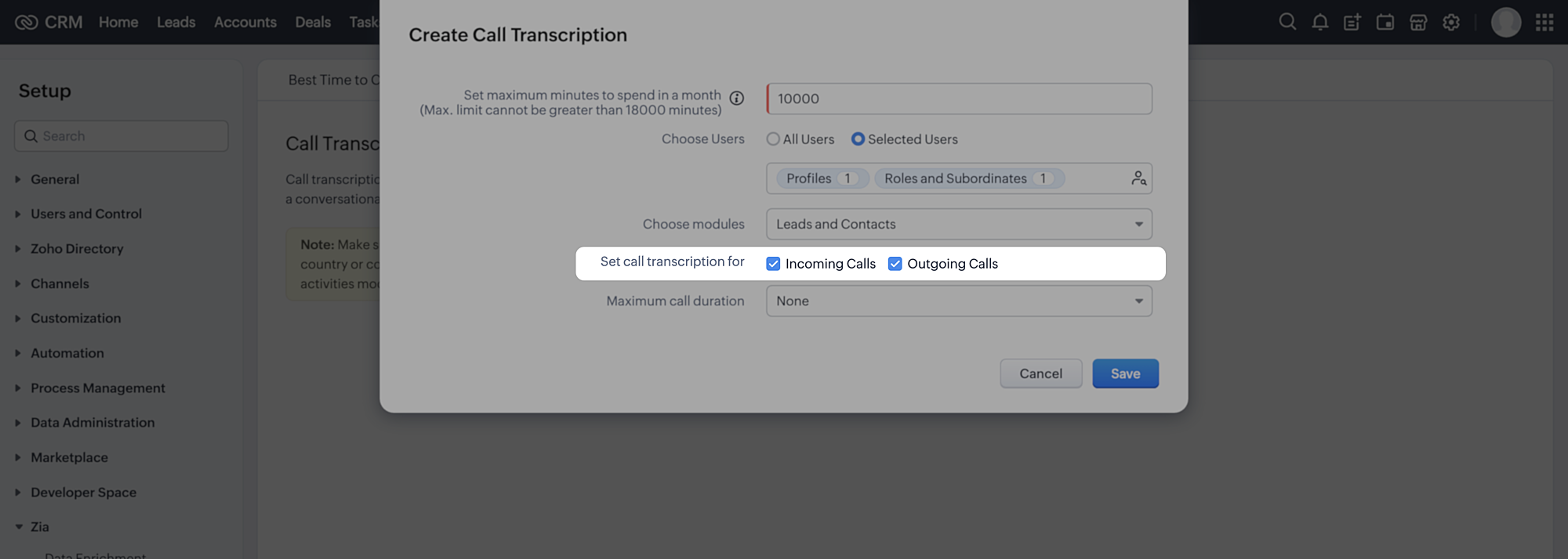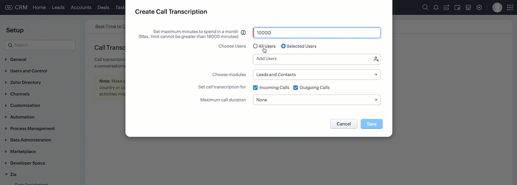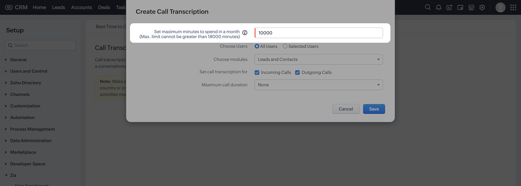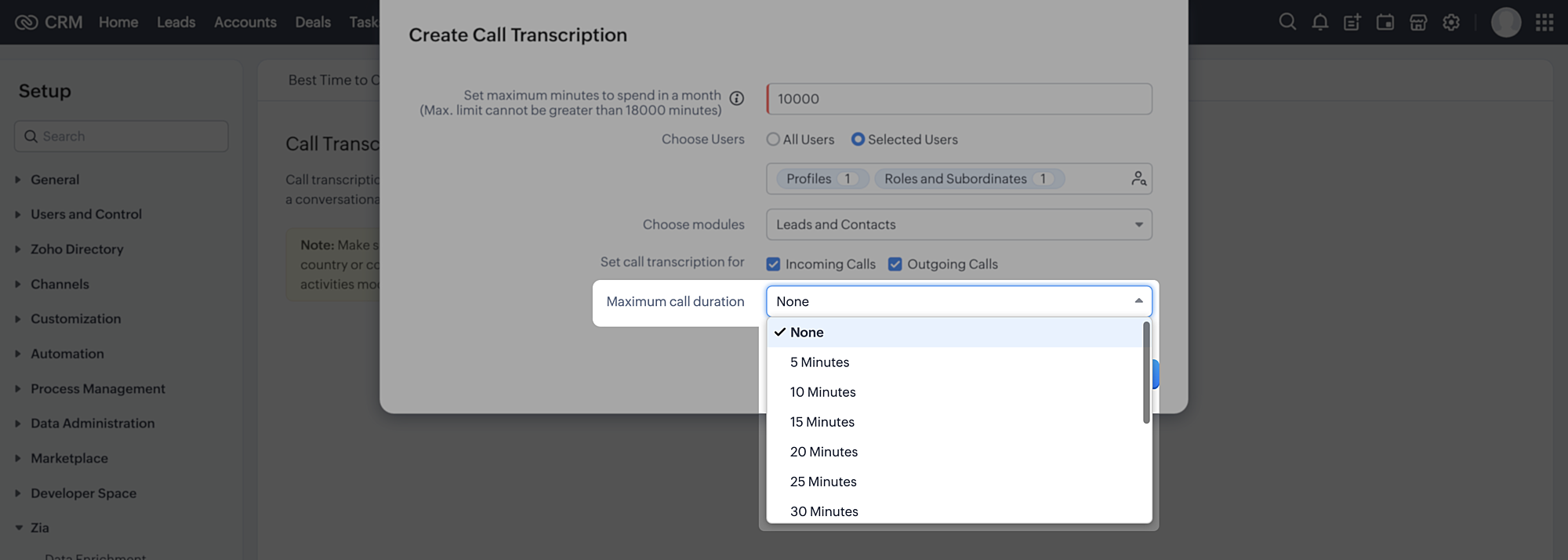 - Administratorii pot seta un prag maxim de timp pentru apeluri în minute pentru ca transcrierea apelului să fie procesată.
