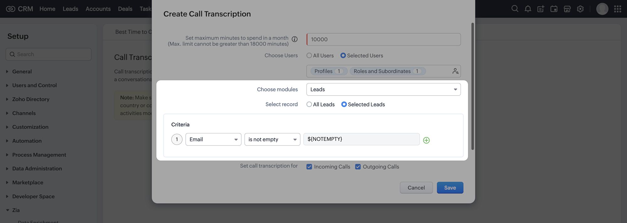 Poți, de asemenea, să specifici criterii de selecție a înregistrărilor în cazul în care selectezi un singur modul (de ex., Leads sau Contacts).