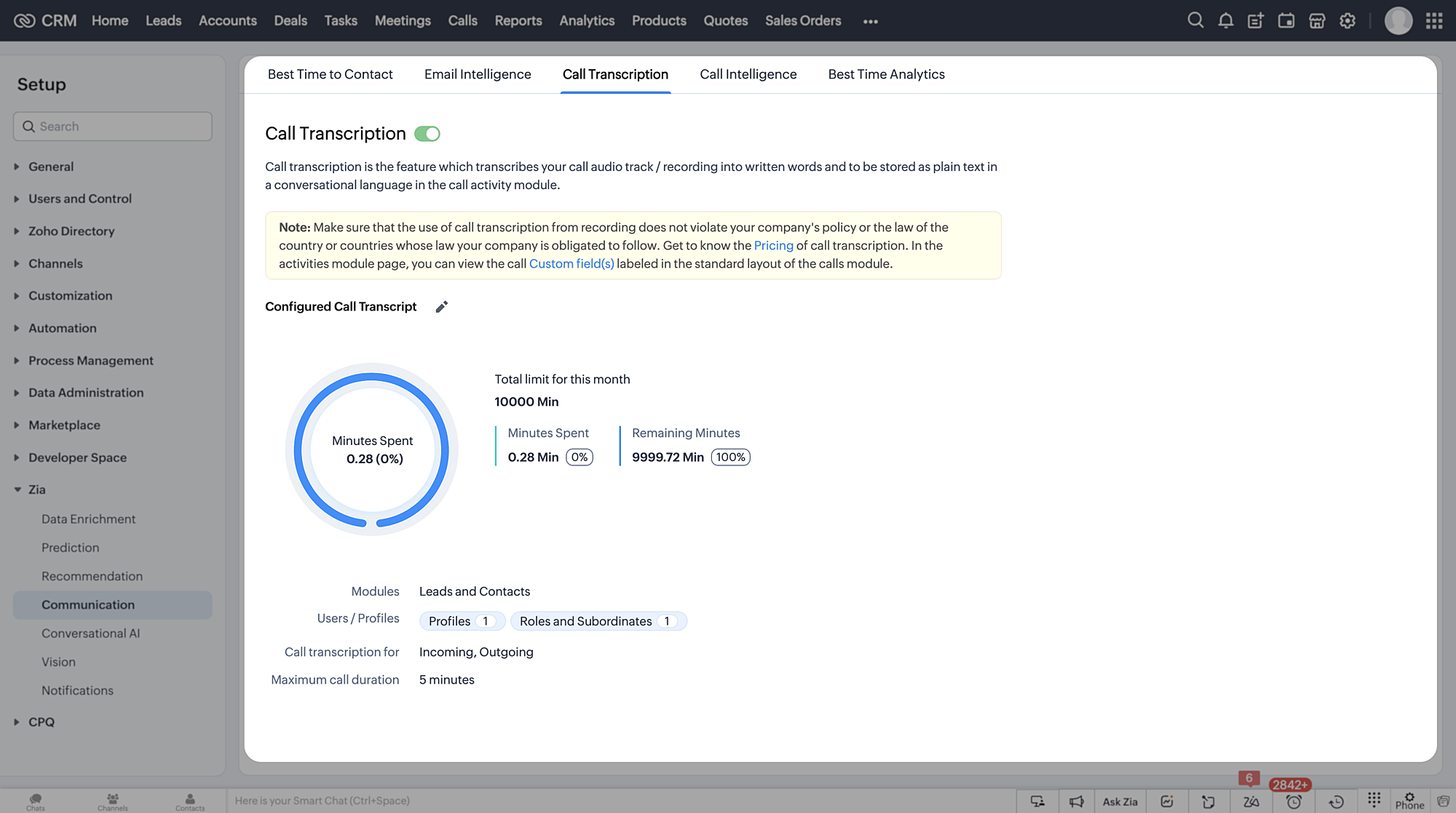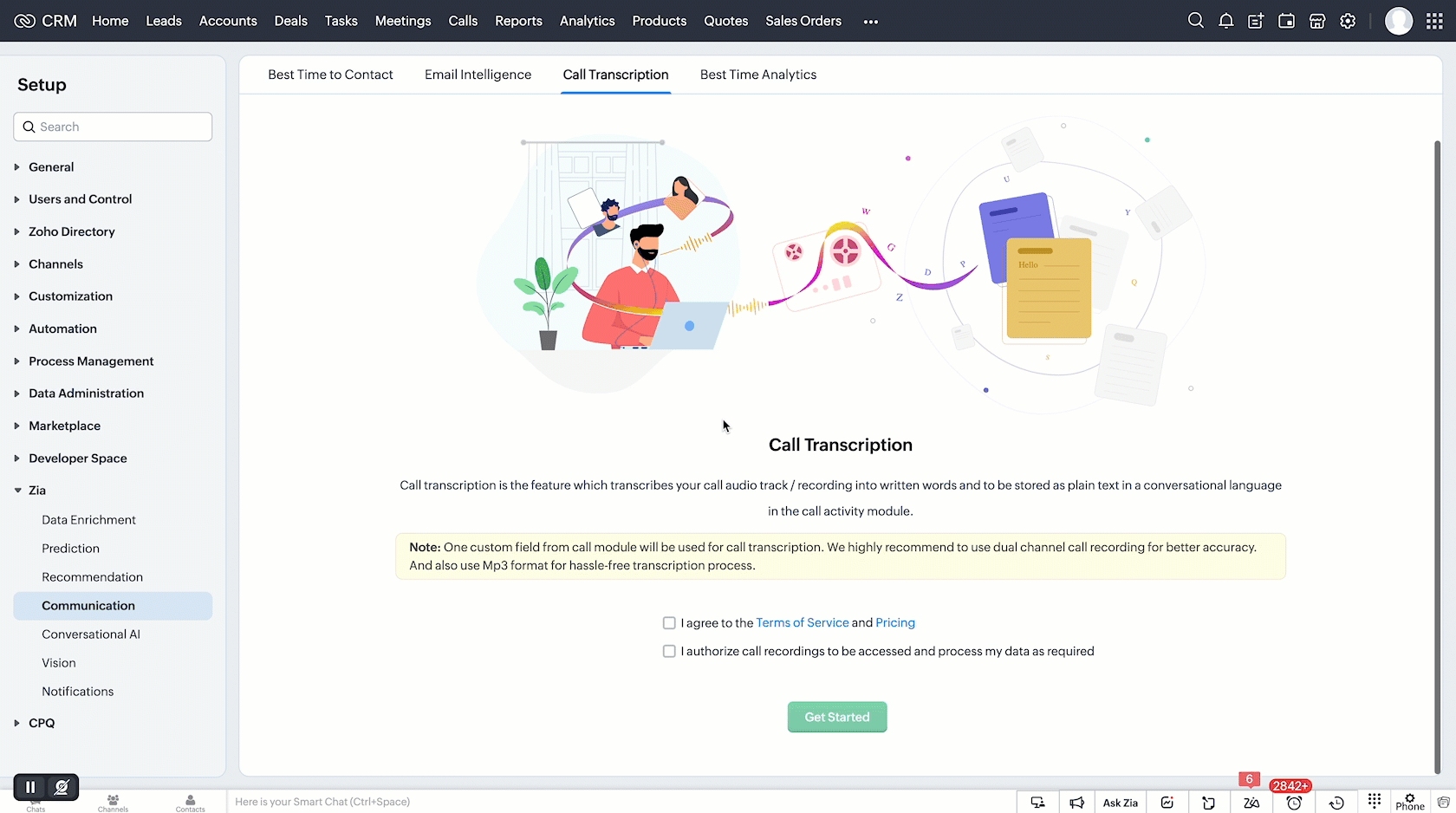 ), apoi apasă pe Communication din opțiunile Zia. - Navighează la tab-ul Call Transcription.