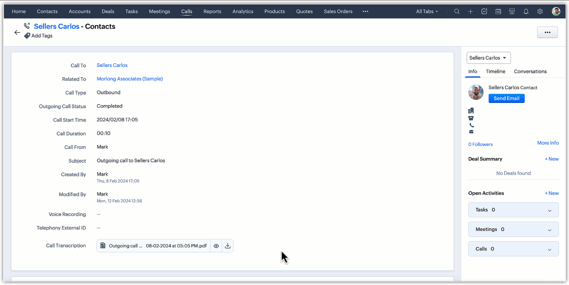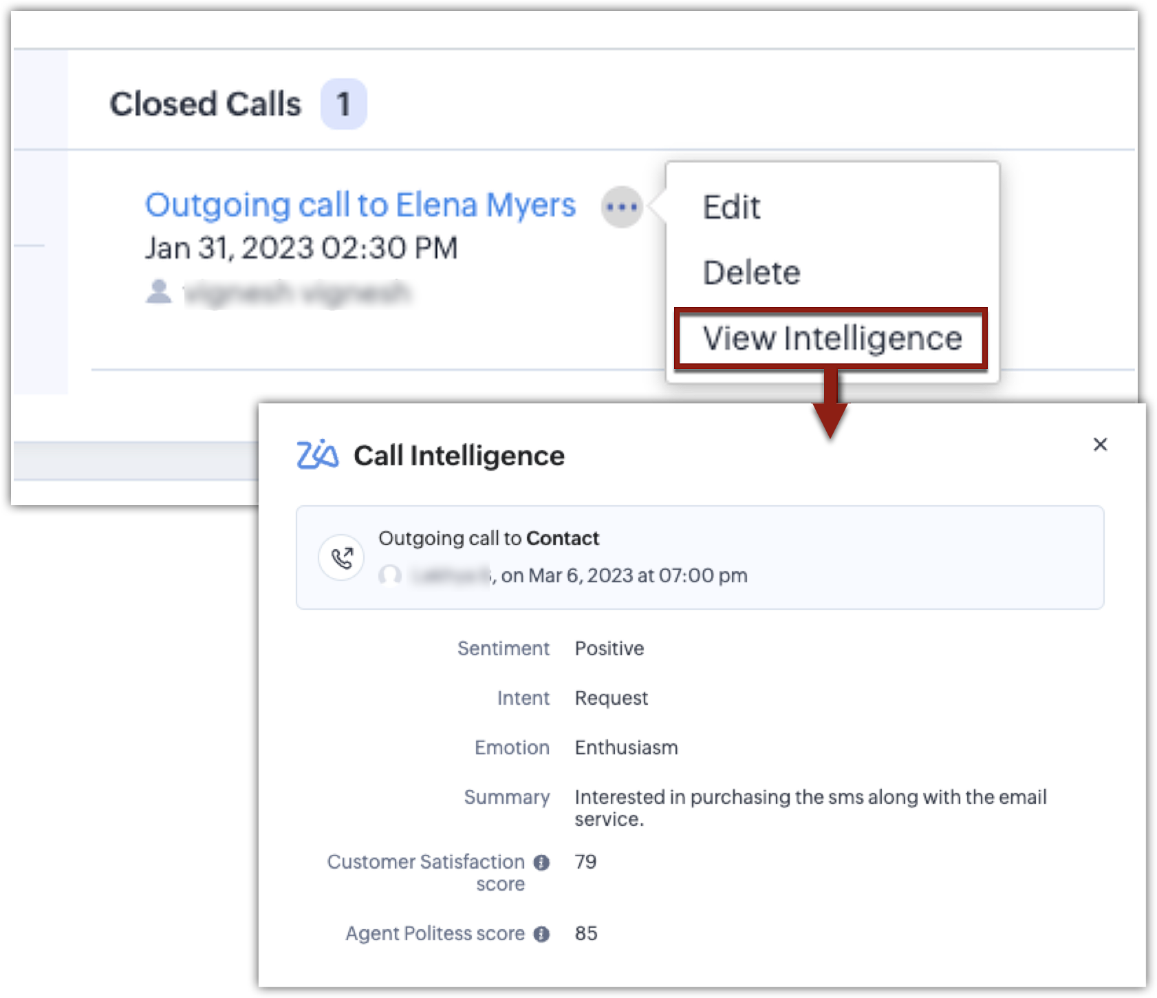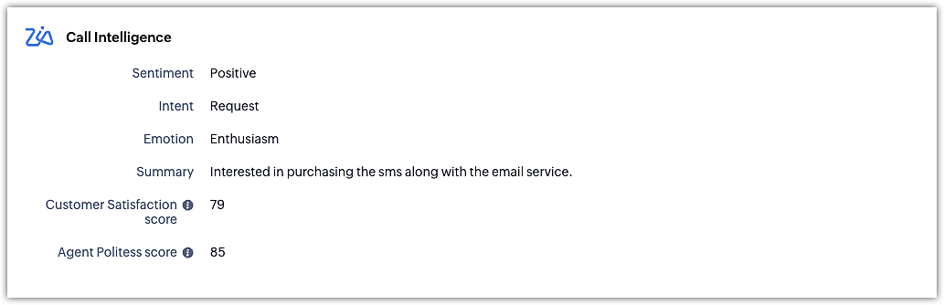 Poți vizualiza analiza detaliată de intelligence a apelurilor realizată de Zia în secțiunea de activități închise a paginii de detalii a înregistrării, precum și direct în secțiunea call intelligence de pe pagina de detalii a unui apel individual din modulul Calls.