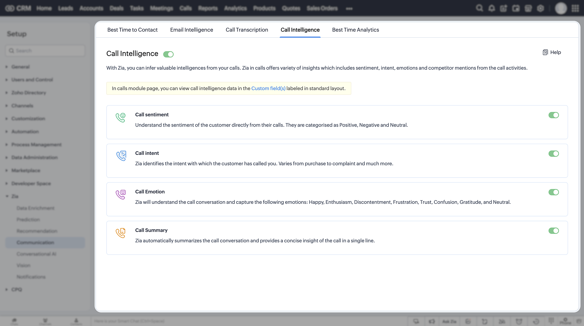 ) și apoi apasă pe Communication din opțiunile Zia. - Navighează la tab-ul Call Intelligence.