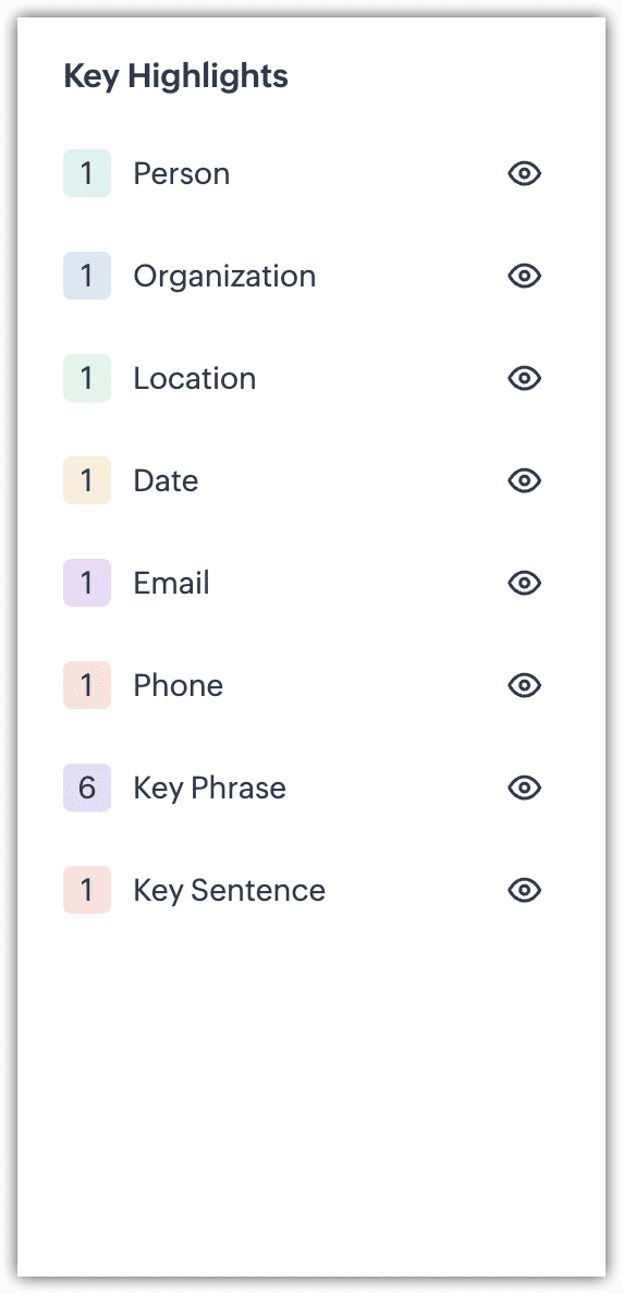 Zia folosește culori pentru a evidenția diferite tipuri de conținut din transcriere, facilitând vizualizarea modului în care aceste cuvinte cheie au fost folosite în timpul conversației. De exemplu, mențiunile persoanelor vor fi evidențiate ca Persoane cu o culoare desemnată, în timp ce mențiunile de e-mailuri, expresii cheie și propoziții cheie vor avea fundaluri de culori diferite.