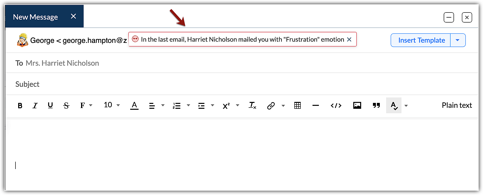 Compunere email: Când creezi un email nou pentru o înregistrare, cea mai recentă emoție calibrată pentru adresa de email va fi afișată pentru a te ajuta să redactezi emailul ținând cont de emoția observată.