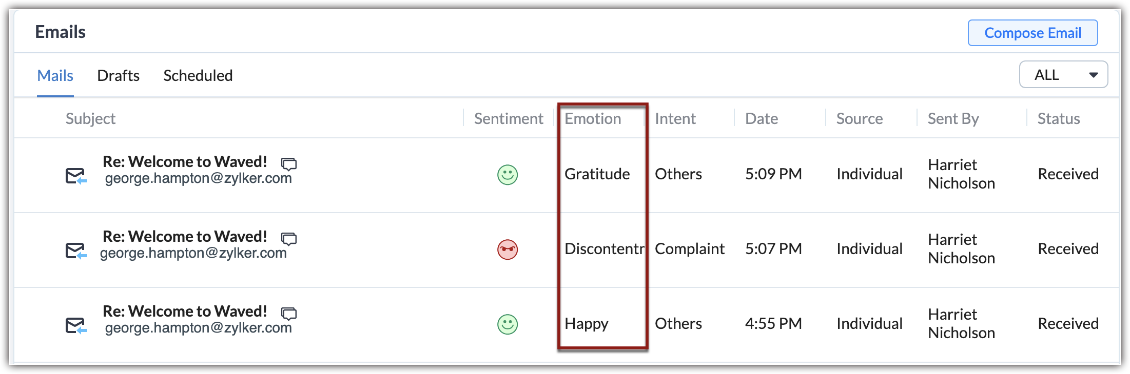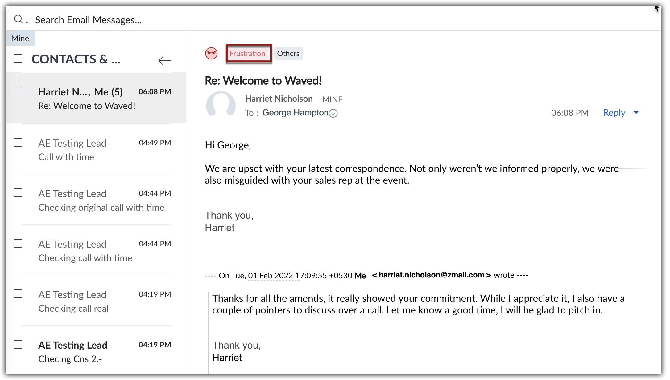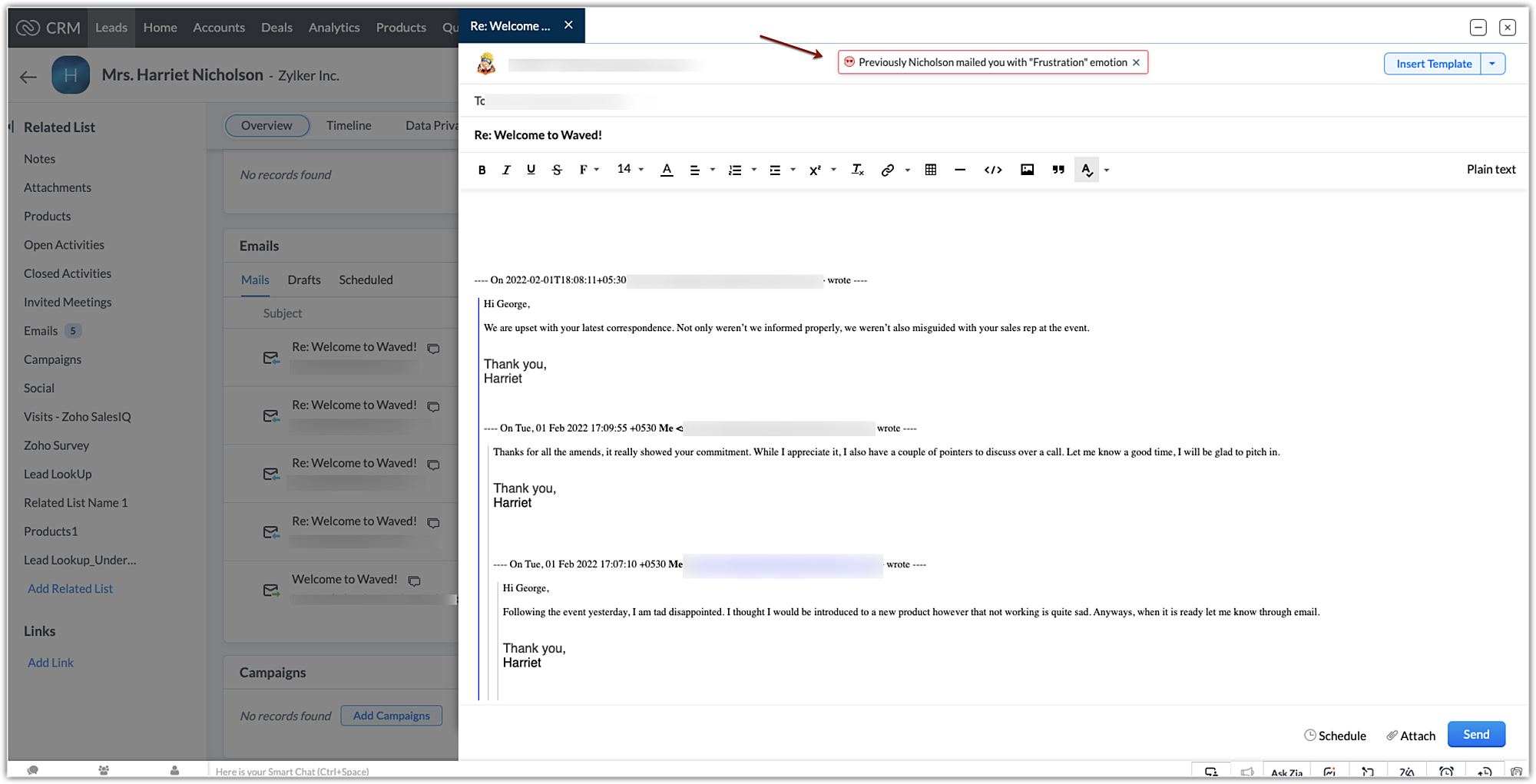 Emoțiile captate dintr-un email primit sunt afișate în următoarele locuri din Zoho CRM.
