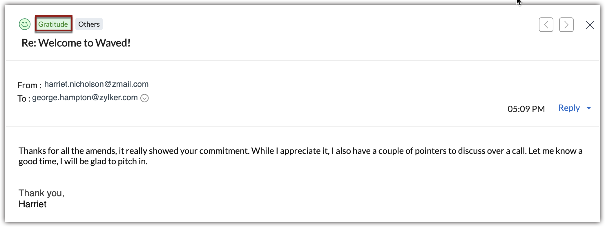 În interiorul emailului: În interiorul emailului, emoțiile sunt afișate în colțul din stânga sus. Dacă o înregistrare are mai multe schimburi de emailuri, emoția va fi afișată pentru fiecare email.