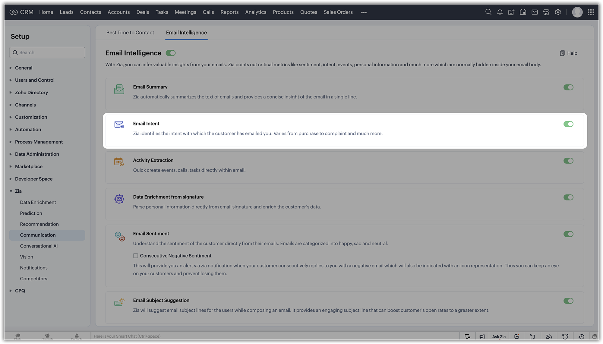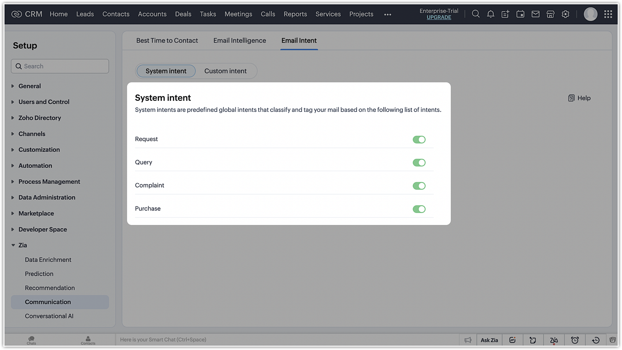 În tab-ul System Intent disponibil sub Email Intent, poți comuta intențiile predefinite de sistem pentru a activa și dezactiva sugestiile Zia. Implicit, la activarea intenției din email, intențiile predefinite de sistem sunt activate automat.