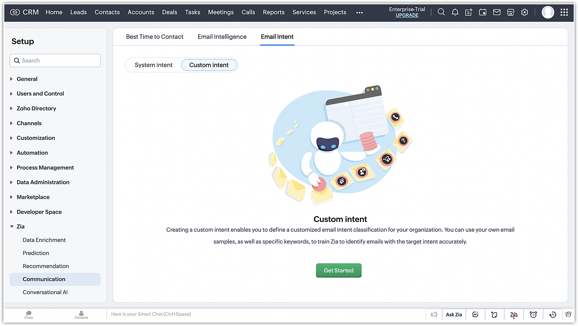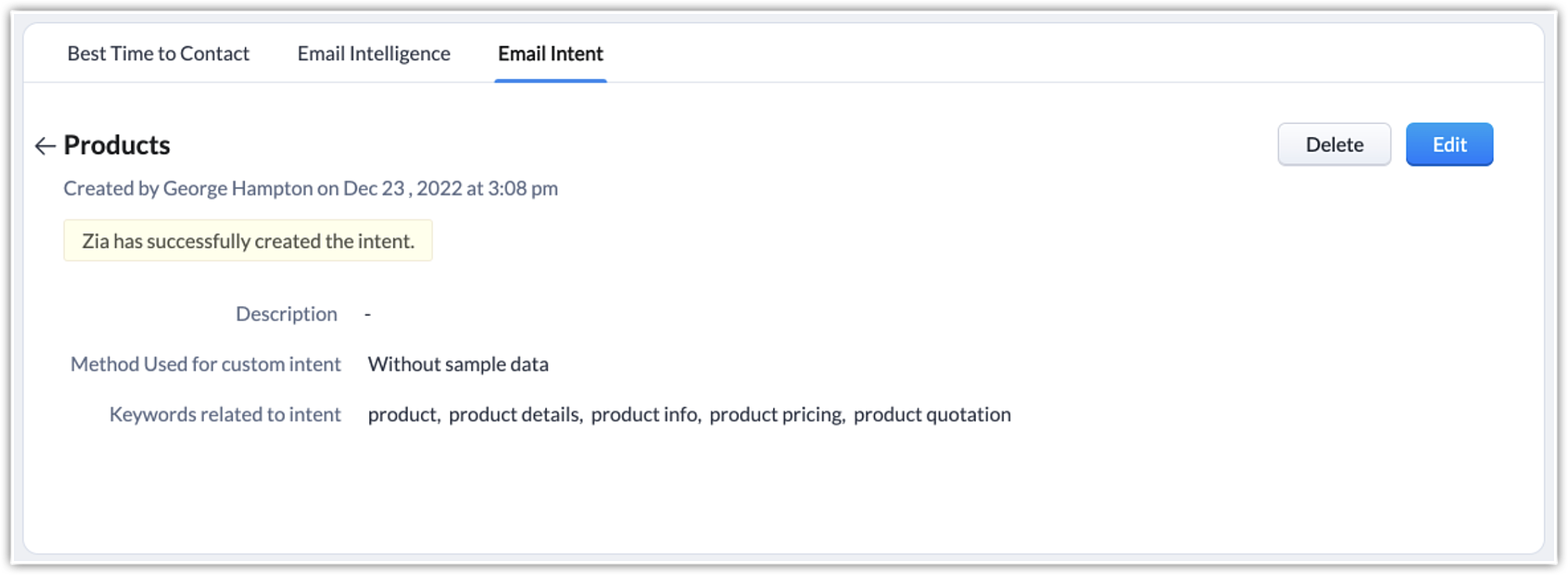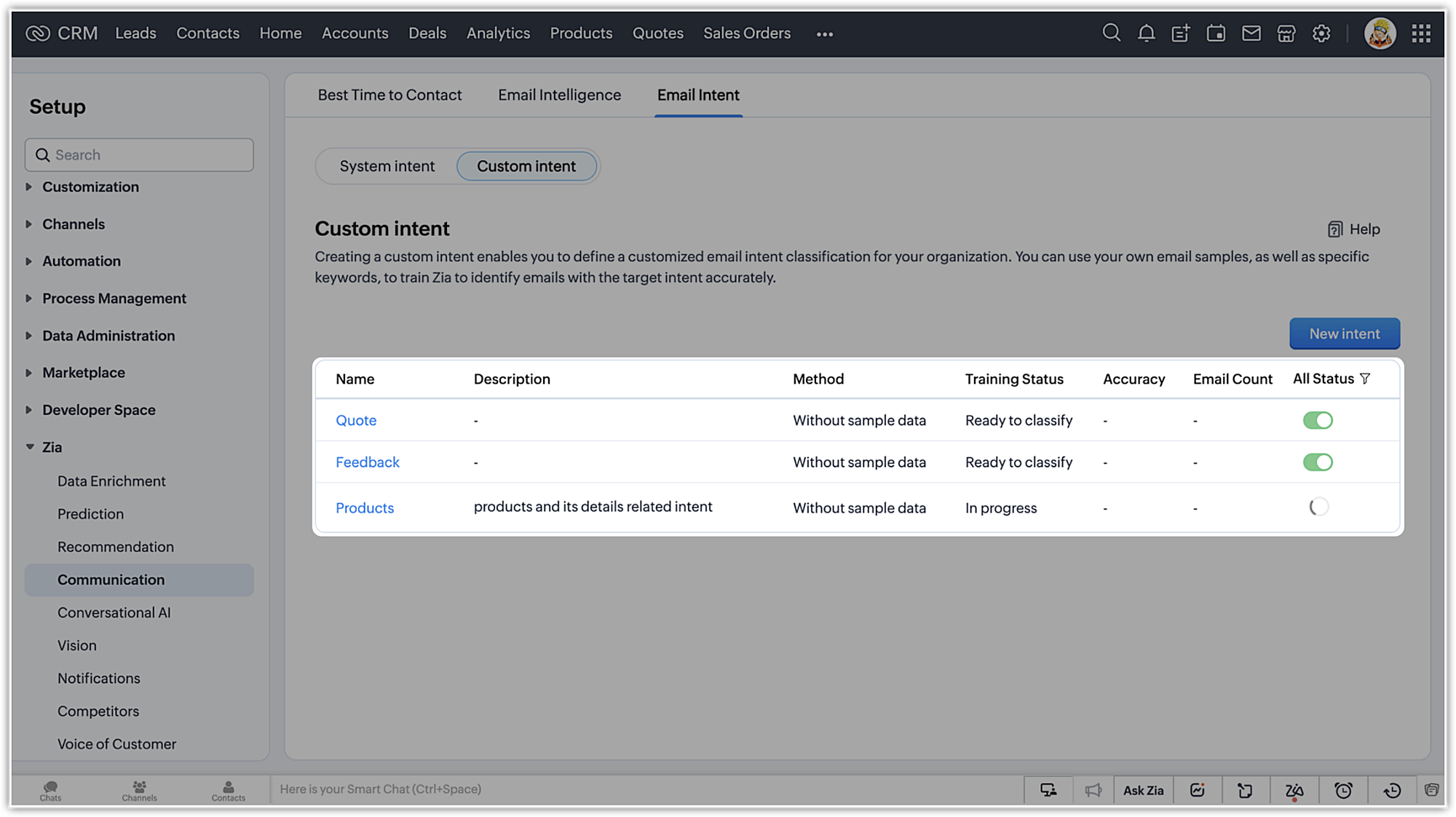 Aici intervine Zia cu funcția sa de analiză a intenției din email. Aceasta monitorizează conversațiile prin email pentru a înțelege intenția clientului, clasifică intenția fiecărui email și le etichetează corespunzător. Poți configura intenții predefinite de sistem sau chiar să ai propriile intenții personalizate în funcție de nevoile organizației tale.