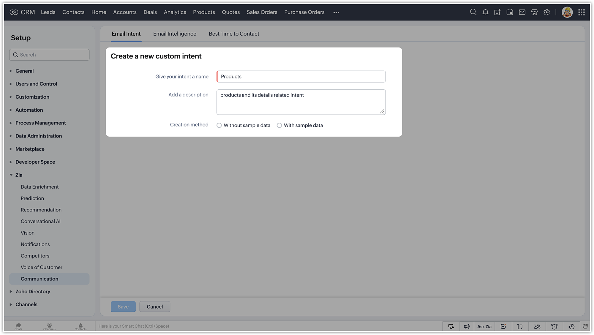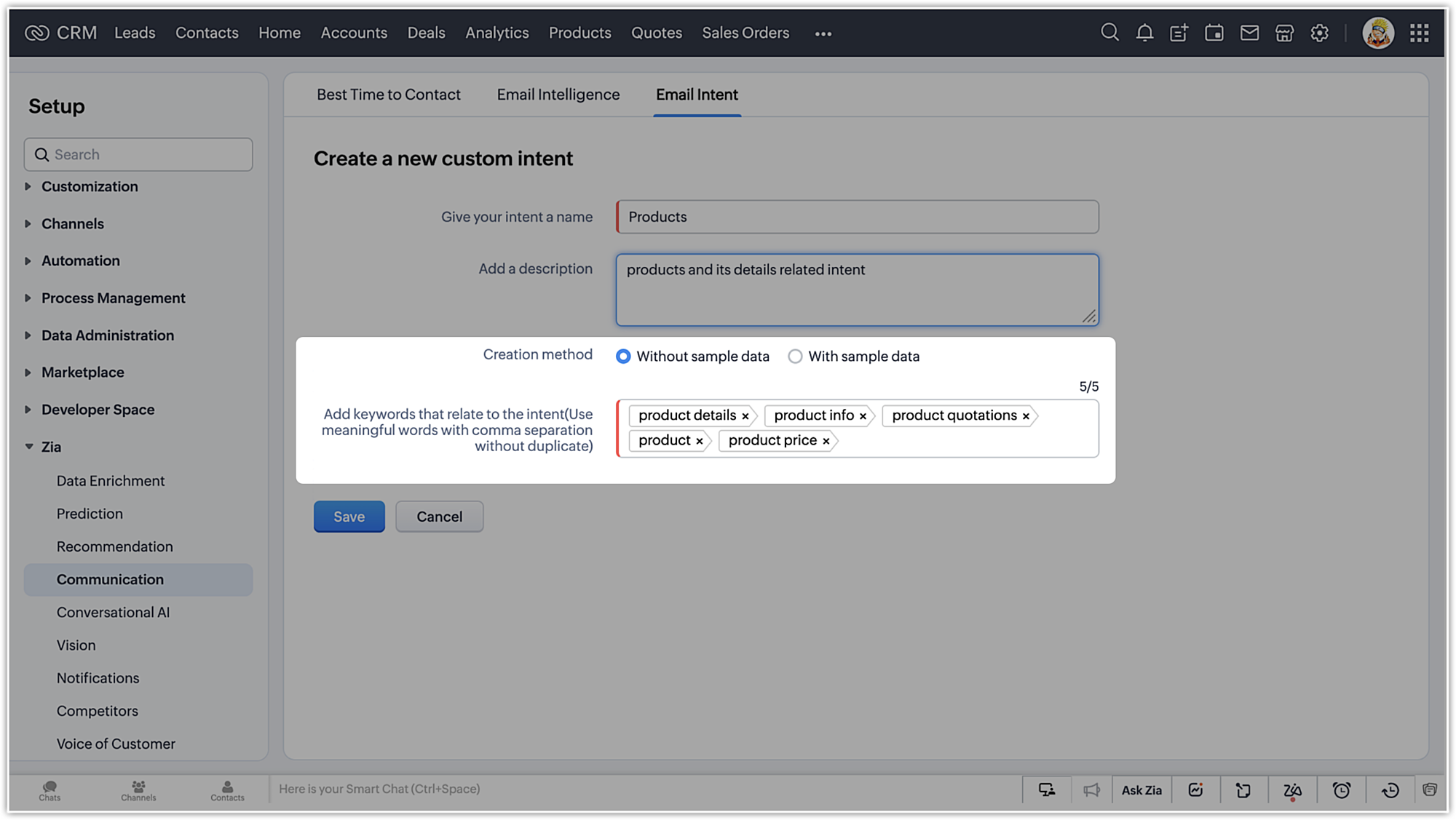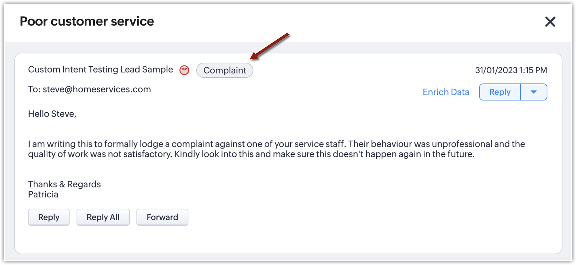 Aici intervine Zia cu funcția sa de analiză a intenției din email. Aceasta monitorizează conversațiile prin email pentru a înțelege intenția clientului, clasifică intenția fiecărui email și le etichetează corespunzător. Poți configura intenții predefinite de sistem sau chiar să ai propriile intenții personalizate în funcție de nevoile organizației tale.