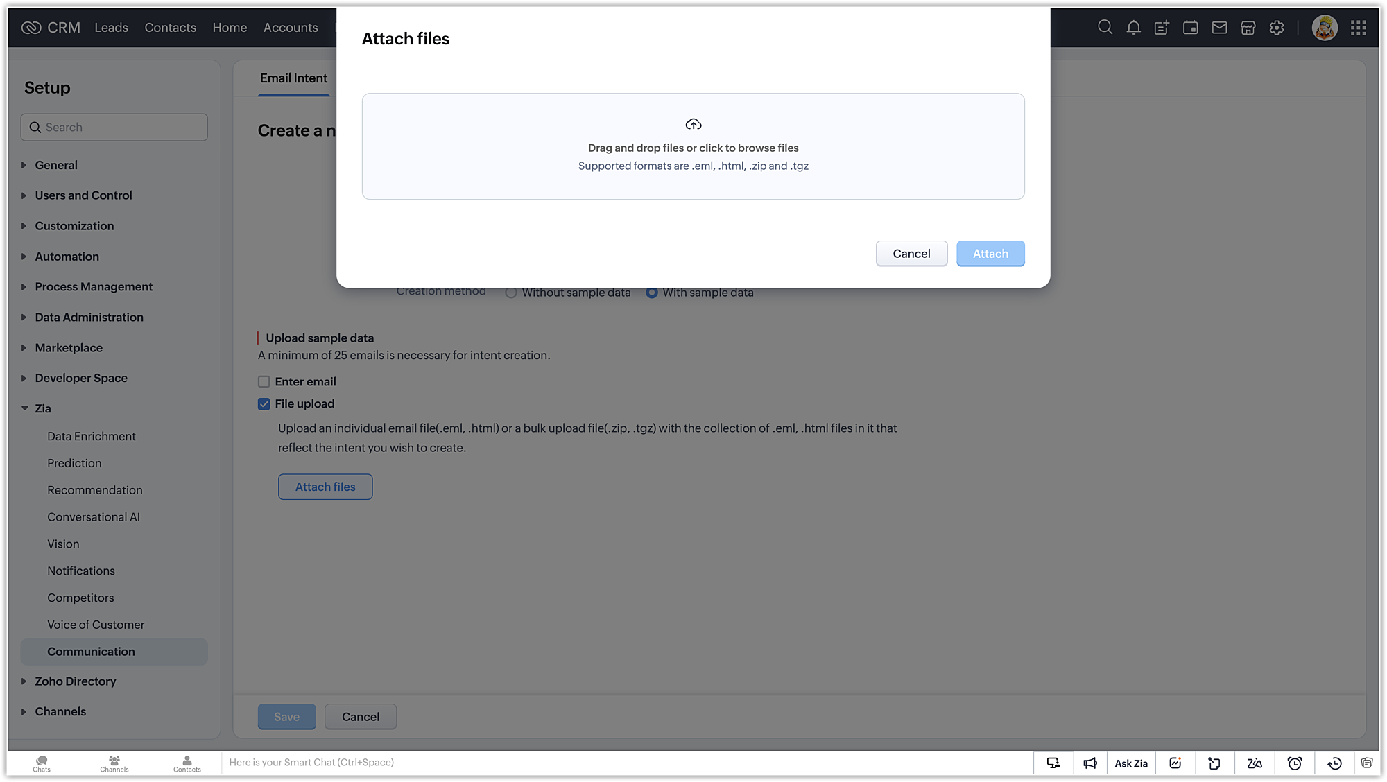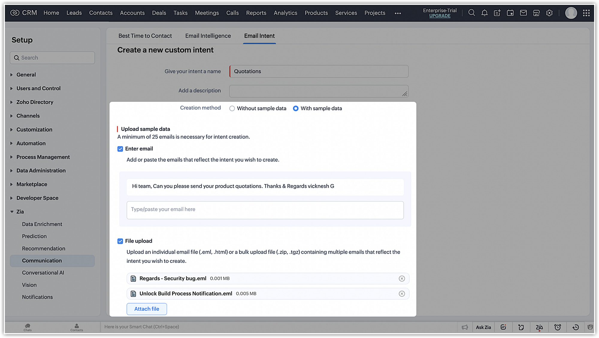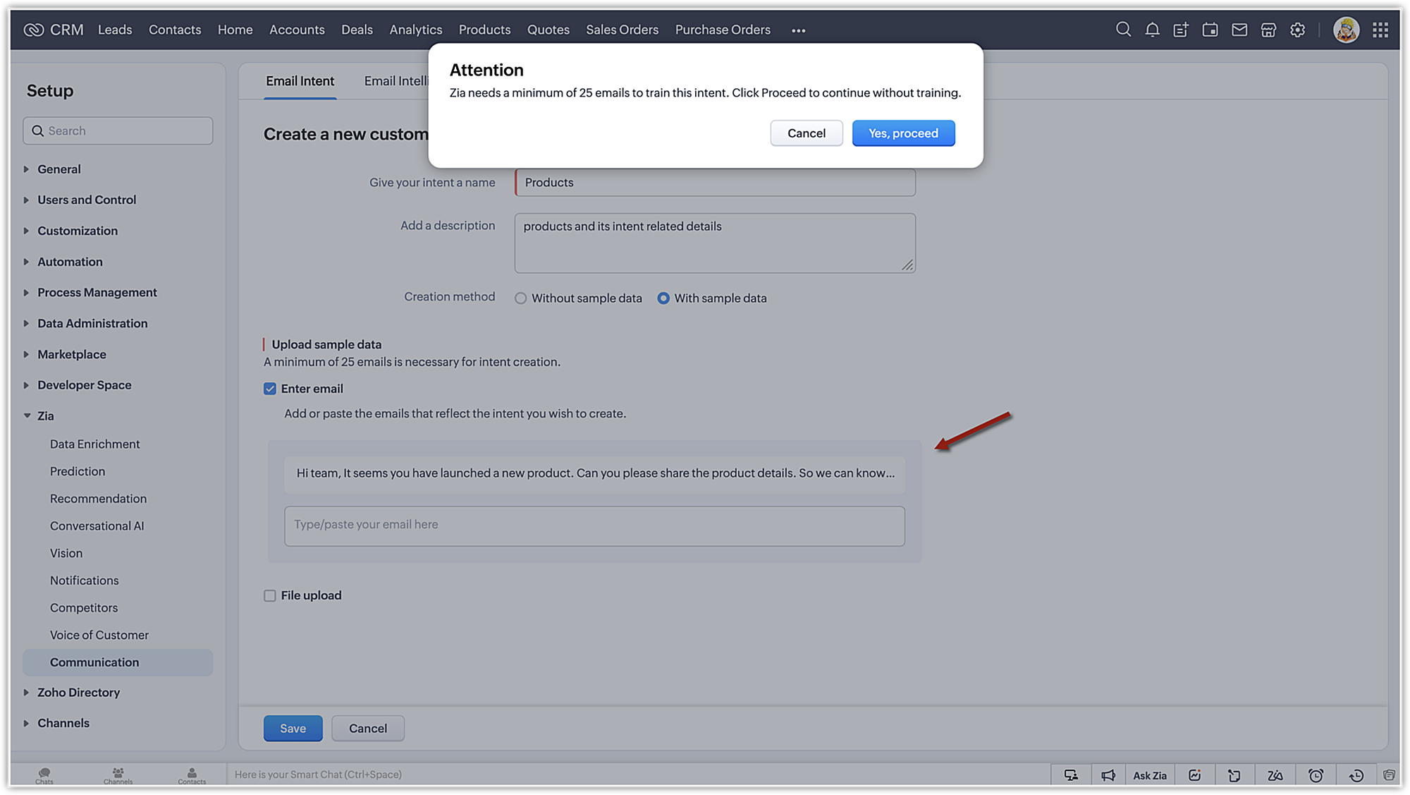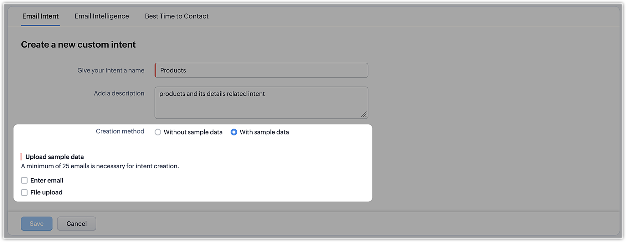 - Pentru intențiile cu date de exemplu, sunt necesare minimum 25 de conținuturi de email de exemplu pentru ca Zia să înceapă antrenamentul pentru intenția personalizată. Cele 25 de conținuturi de exemplu pot fi orice combinație de emailuri introduse sau fișiere încărcate. Dacă ai furnizat mai puțin de 25 de emailuri de exemplu, poți totuși să salvezi intenția personalizată, dar Zia nu se va antrena pe aceasta.