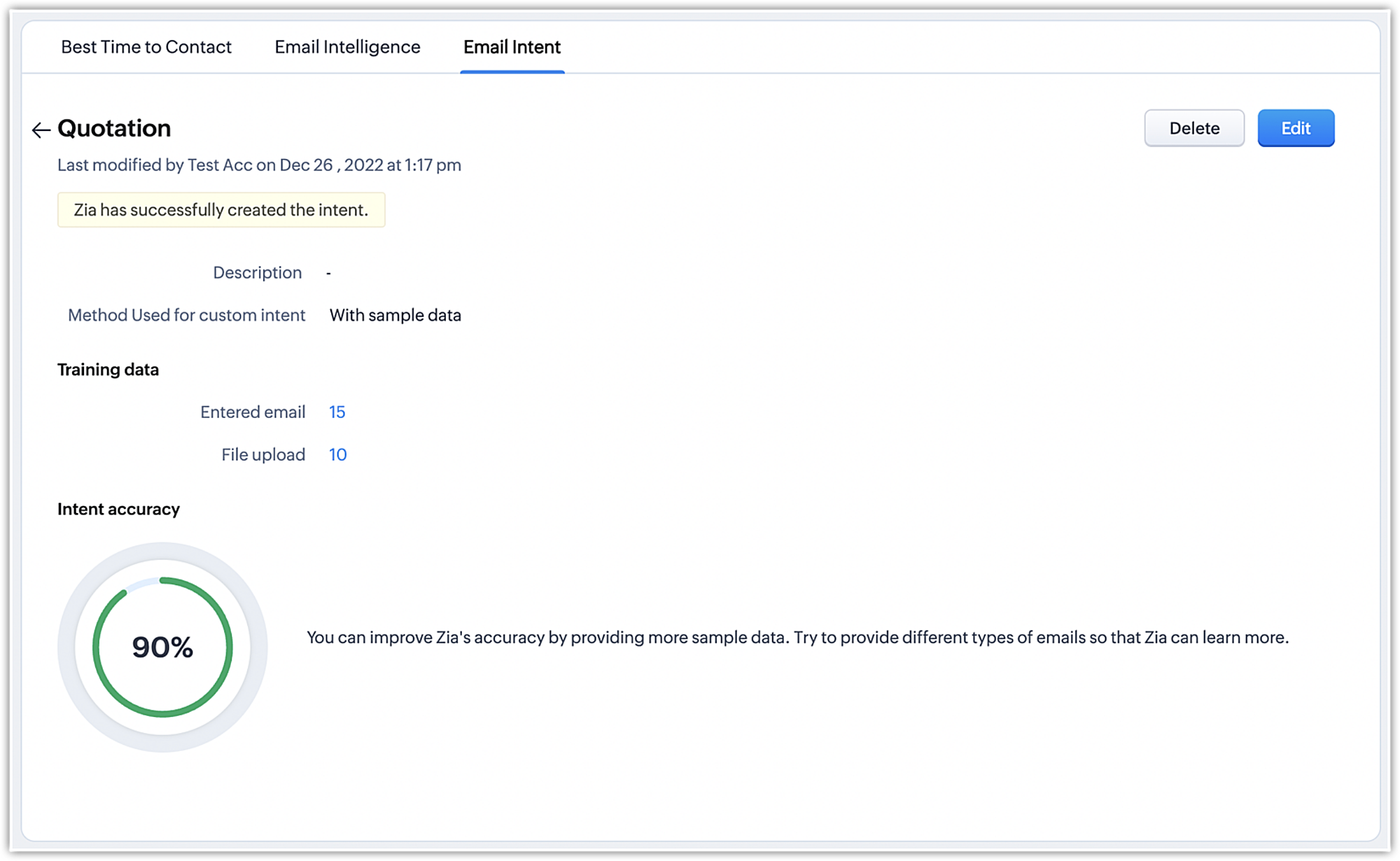 - Acuratețea modelului Zia Intents crește pe baza cantității și varietății emailurilor de antrenament furnizate.