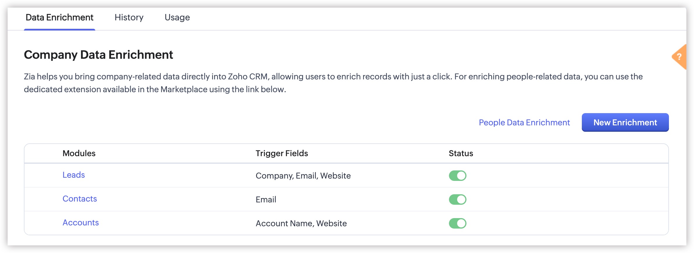 - Mergi la Setup > Zia > Data Enrichment > History.