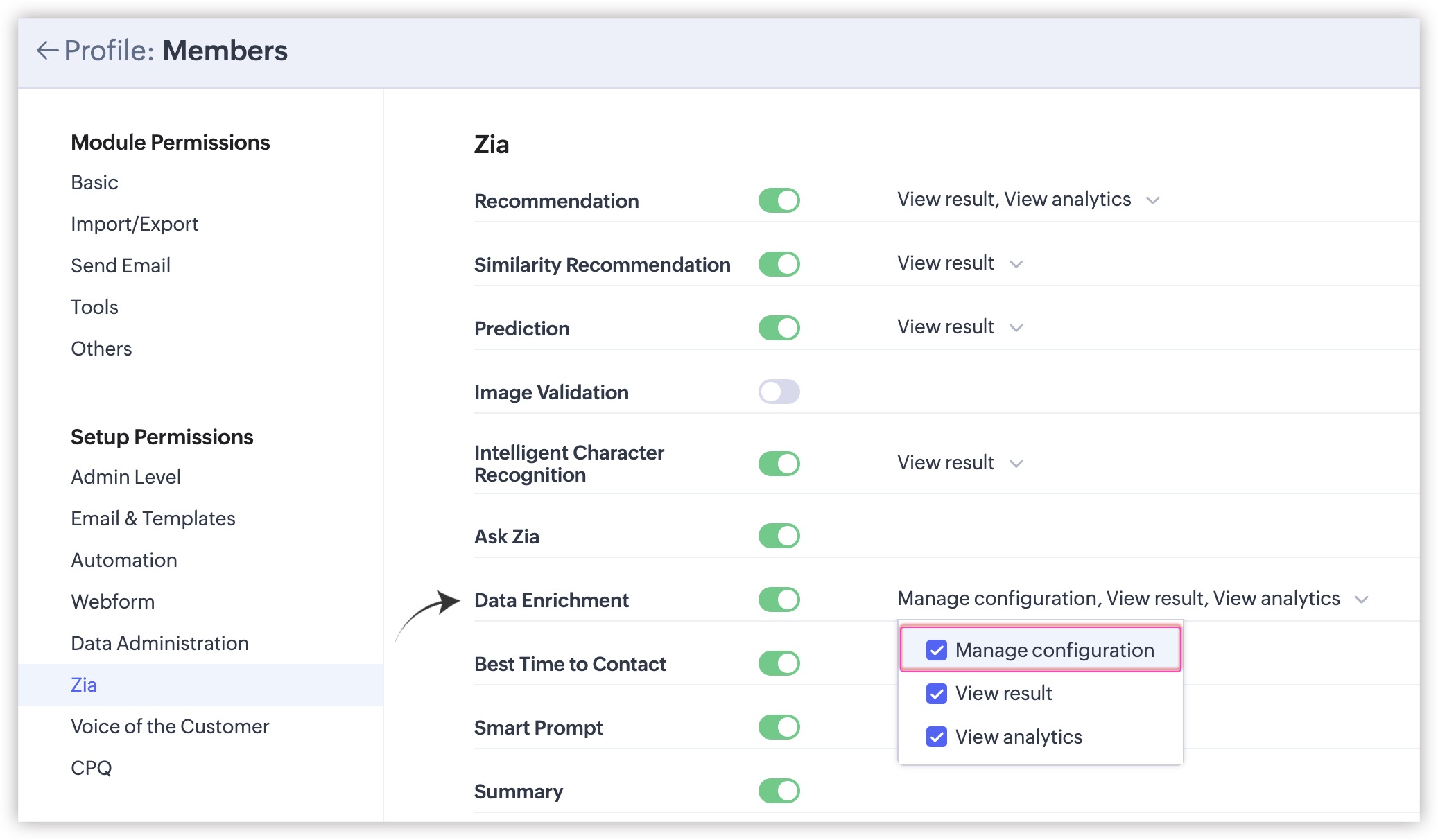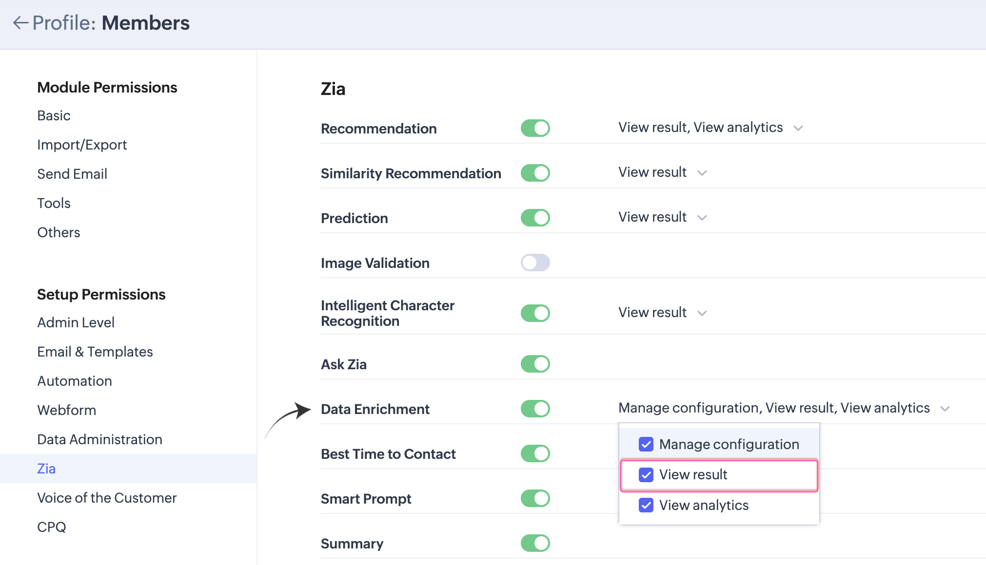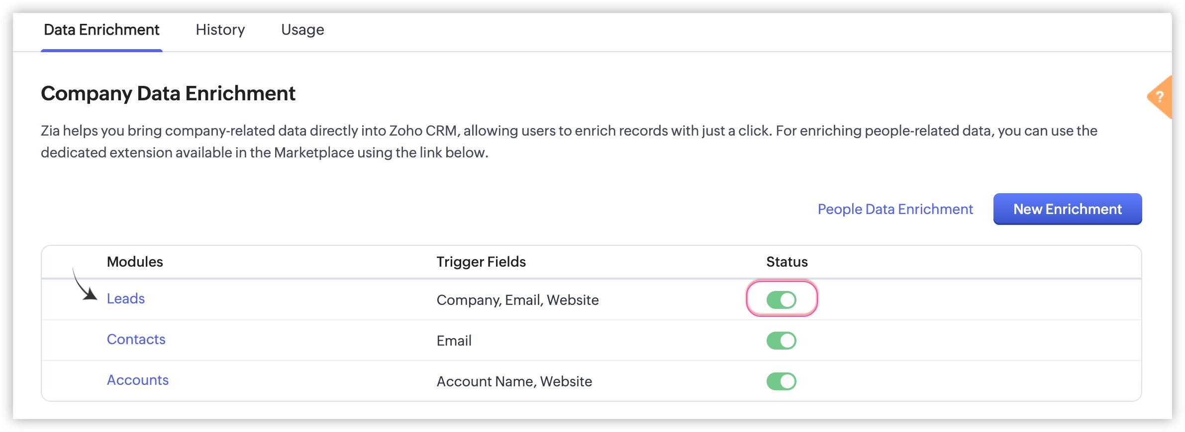 - Activare/dezactivare: Este posibil să activezi îmbogățirea datelor doar pentru modulele selectate. De exemplu, poți activa doar pentru modulele Leads și Contacts și nu pentru modulul Accounts.