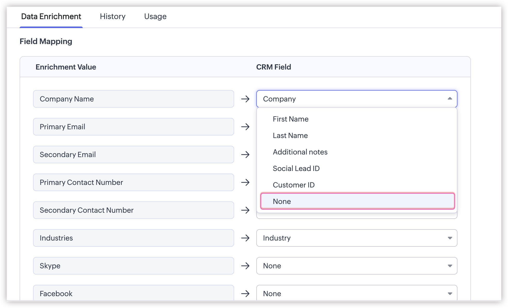 - Alege câmpul Zoho CRM din lista derulantă pentru a-l mapa cu câmpul de îmbogățire corespunzător.
