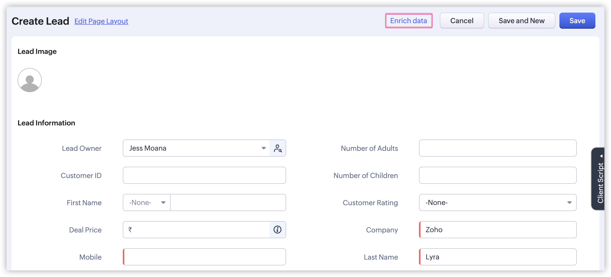 - În pagina de creare, fă clic pe linkul Enrich data după ce ai introdus câmpurile primare precum Email Address, Website sau Company Name.