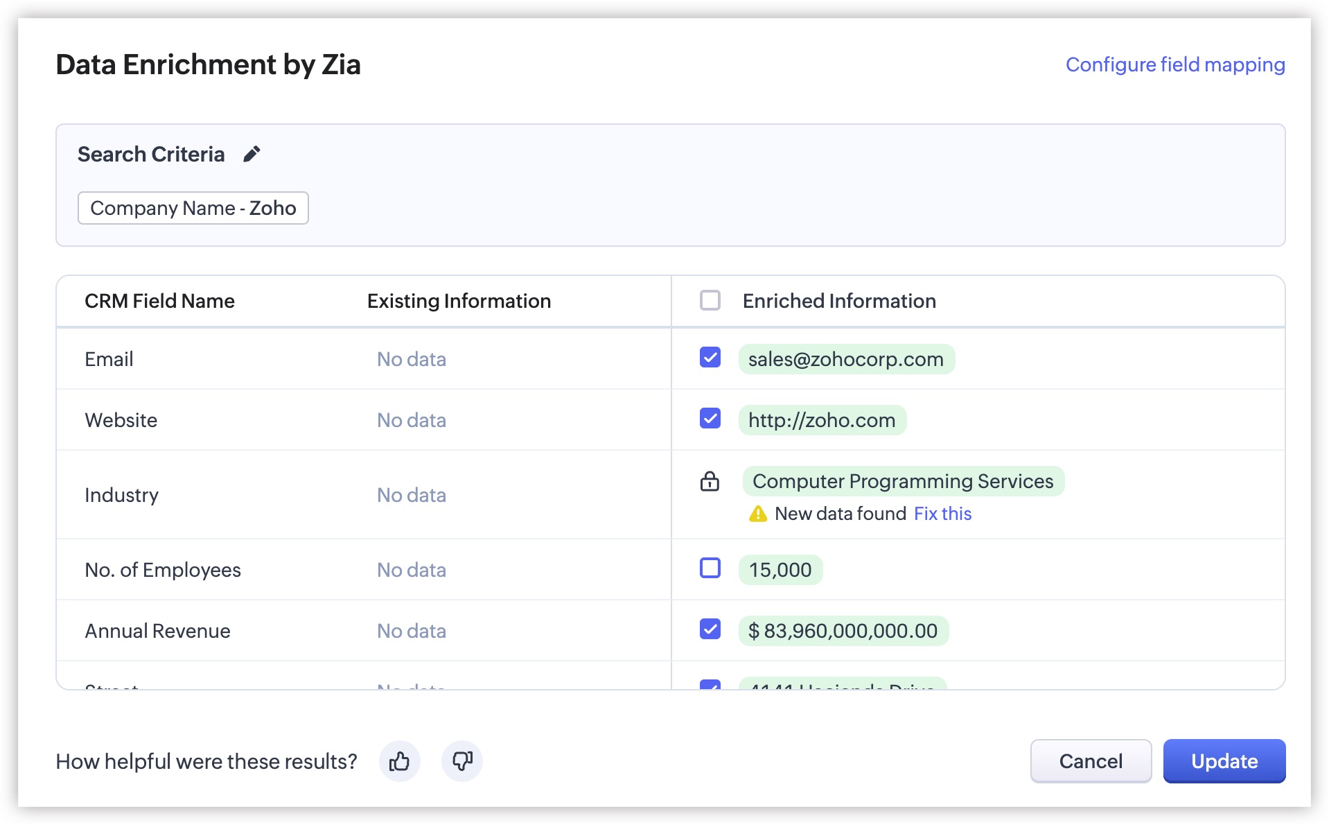 Pentru fiecare modul, Zia colectează informații specifice câmpurilor primare, îmbunătățind înregistrarea cu detalii relevante și actualizate. Aceste date îmbogățite ajută echipa ta de vânzări să personalizeze comunicarea și să îmbunătățească predicțiile de conversie a lead-urilor.