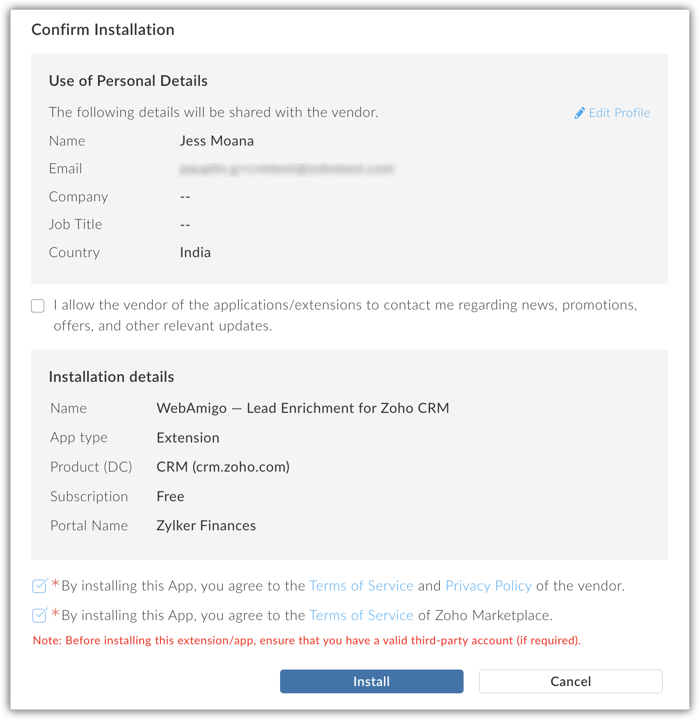 - În fereastra pop-over Confirmă instalarea, bifează casetele necesare și apasă Install.