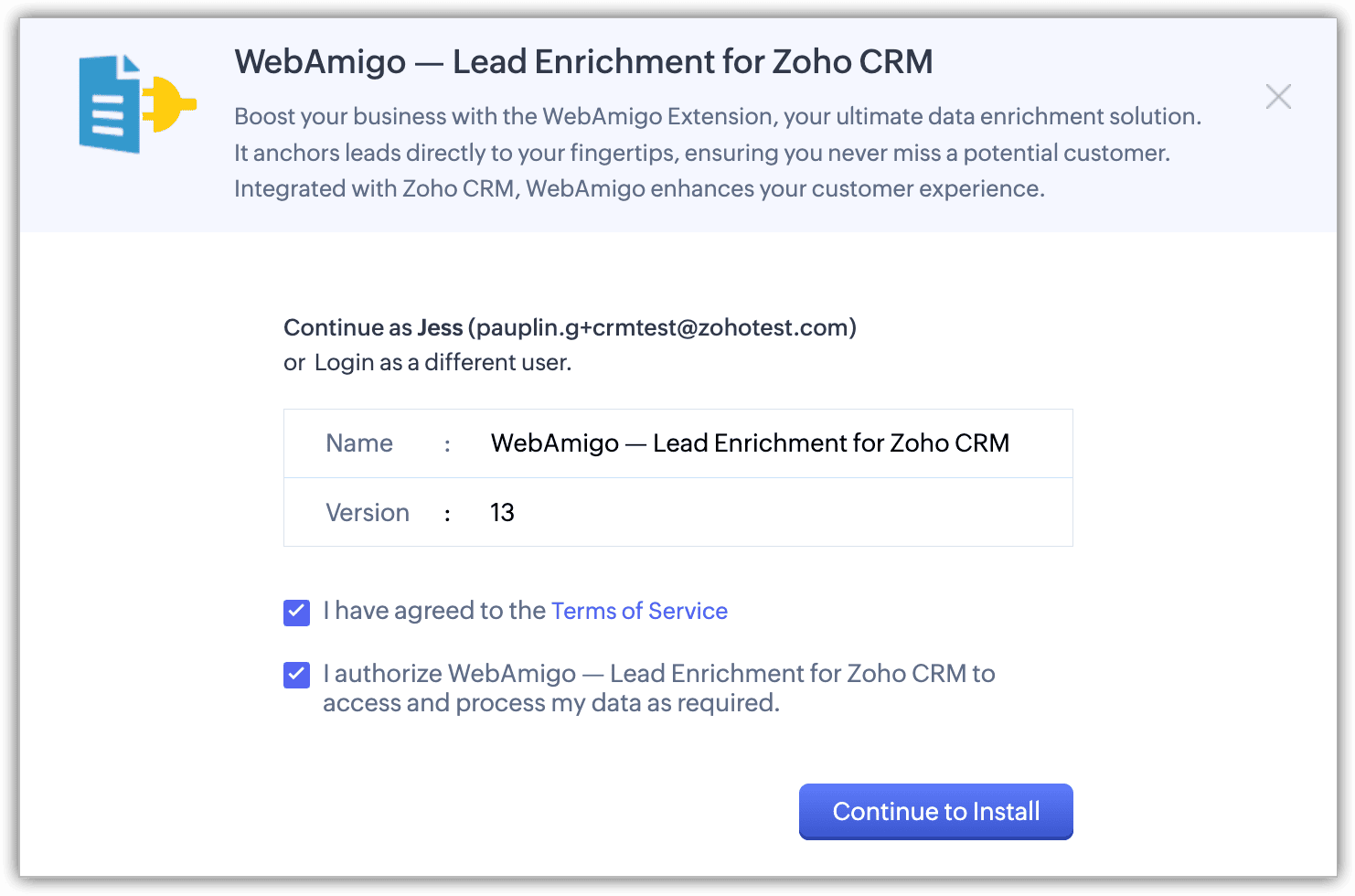 - Pe pagina următoare, acceptă Termenii serviciului și autorizarea, apoi apasă Continue to Install.