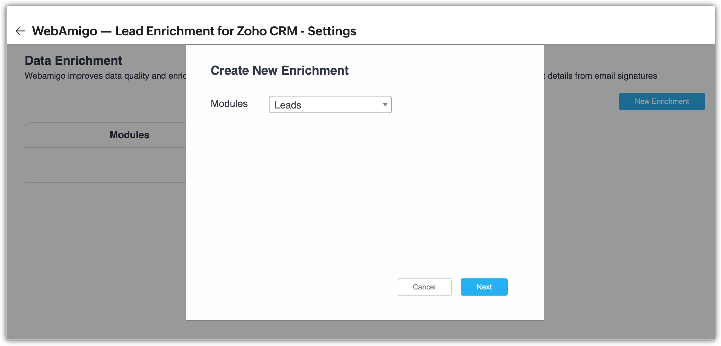 - Alege modulul pentru care dorești îmbogățirea datelor despre persoane și apasă Next.