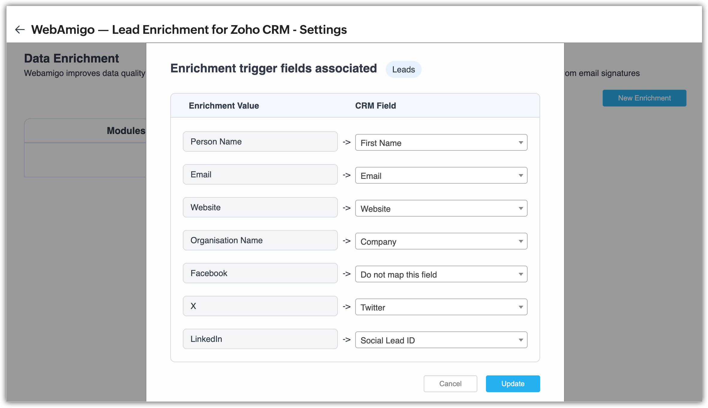 - Asociază valorile de îmbogățire cu câmpurile CRM care urmează să fie actualizate cu valorile îmbogățite. Apasă din nou Update.