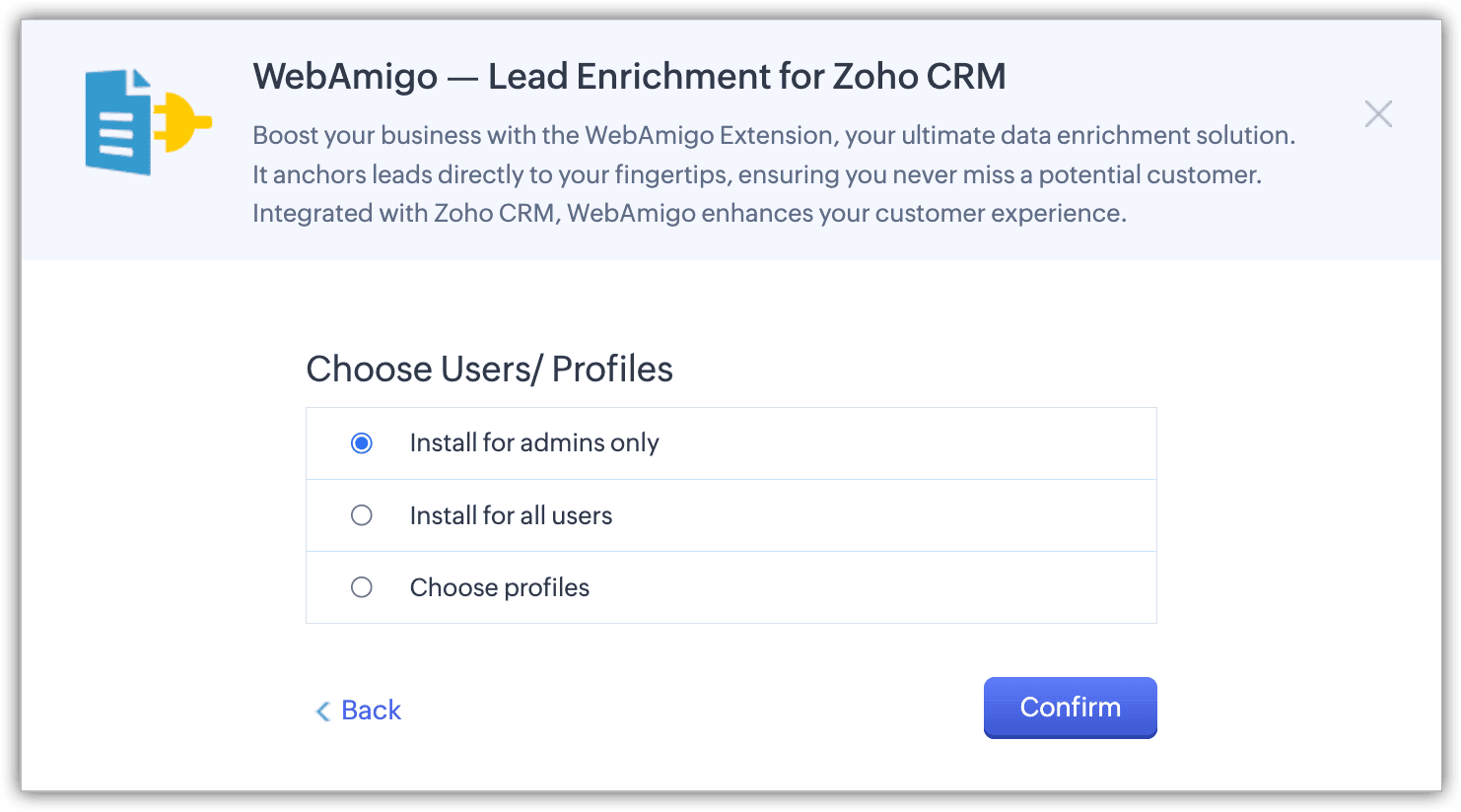 - Alege utilizatorii sau profilurile pentru care dorești să se facă instalarea și apasă Confirm.