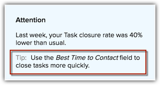 - Atenție: Aceasta îți oferă starea indicatorului tău curent de vânzări față de tendință. Aceste notificări pot fi bazate pe performanța echipei tale sau a ta. De obicei vin cu Sfaturi. Atenție poate fi bazată și pe Workflow Rules.