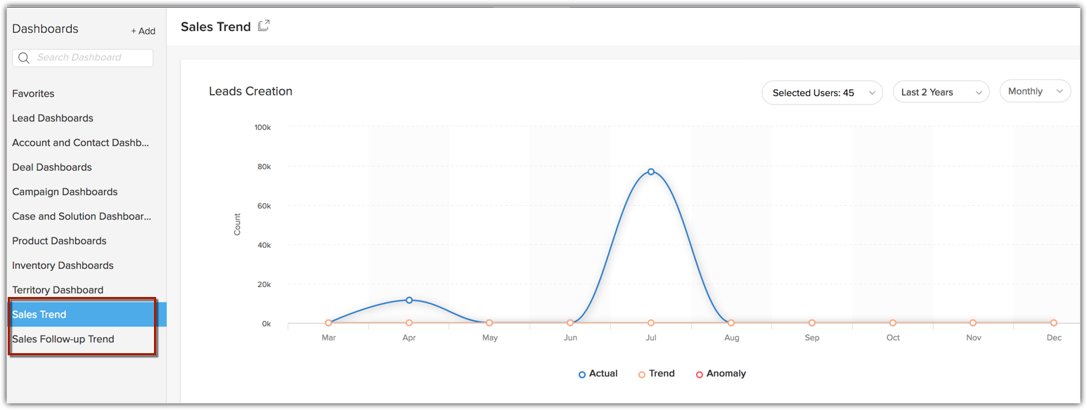 Zoho CRM oferă în prezent unsprezece componente pre-construite în folderele Trend Dashboards. Toate aceste componente sunt afișate ca grafice liniare pentru a arăta tendința pe o perioadă de timp. Poți doar vizualiza aceste componente, dar nu le poți modifica sau adăuga altele noi.