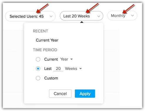 Poți filtra și vizualiza tendința fiecărui tablou de bord în funcție de Utilizatori sau Grupuri și Perioadă de timp. Poți vedea tendința zilnică, săptămânală, lunară sau anuală pentru perioada de timp setată. De asemenea, poți selecta o porțiune specifică a graficului pentru a mări și vizualiza tendința perioadei respective.