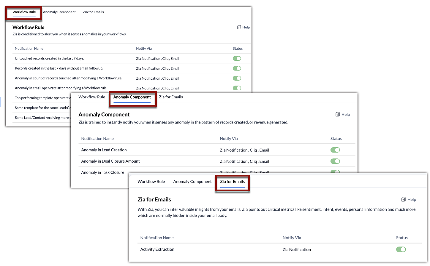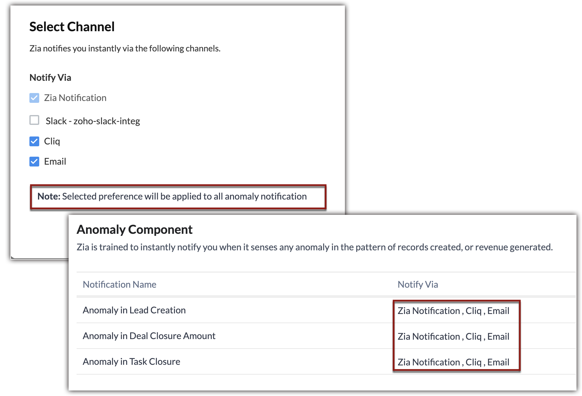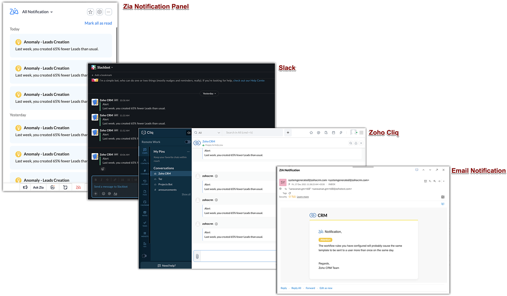 Zia identifică tiparele neobișnuite în regulile de workflow, componentele de anomalie și Zia for emails și te notifică pe mai multe canale precum: