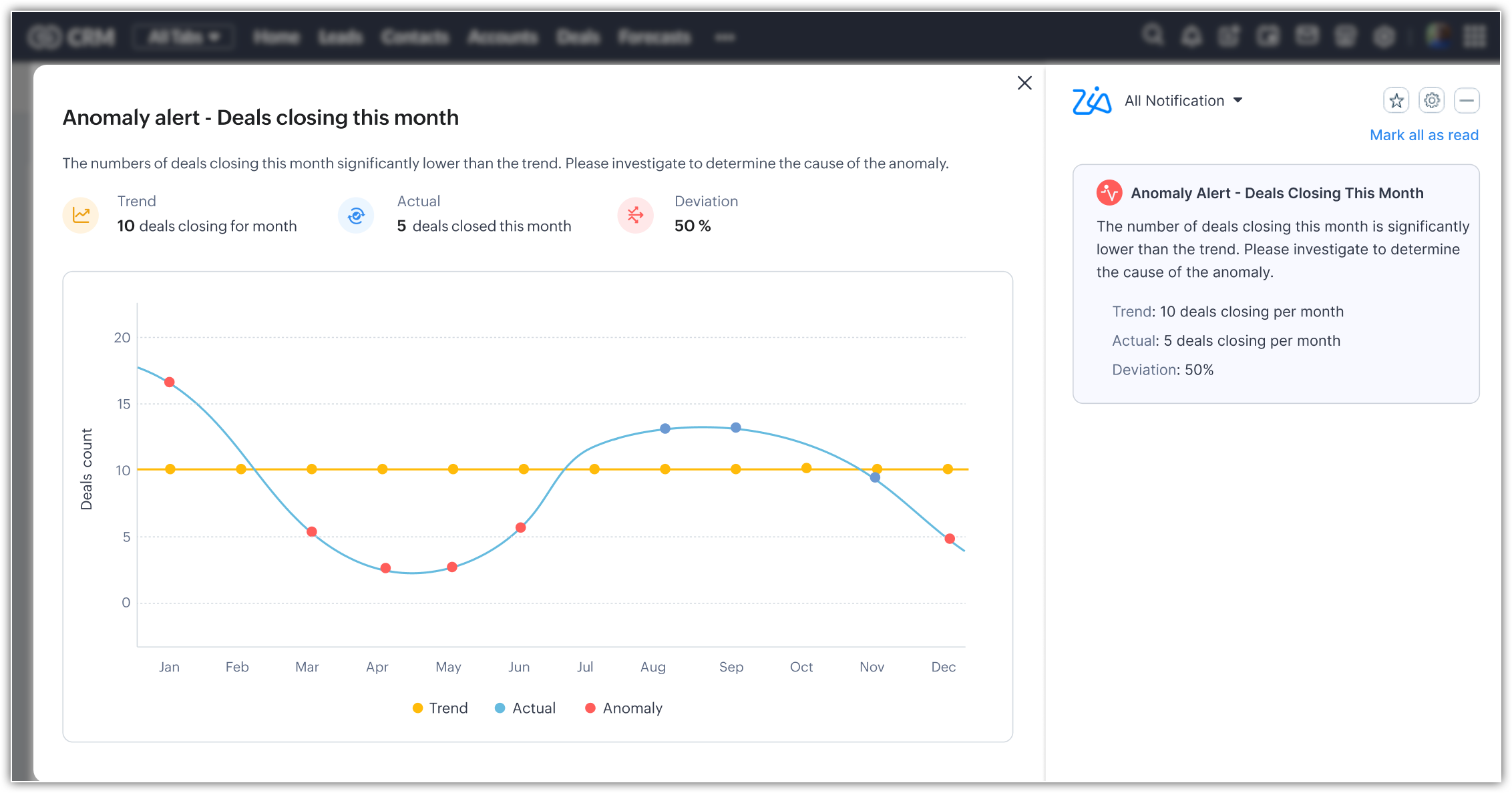 Orice tendință neobișnuită, cum ar fi o scădere sau creștere bruscă a numărului de lead-uri, a numărului de tranzacții închise sau a generării de venituri, va fi urmărită și vei fi notificat. O anomalie nu înseamnă neapărat un impact negativ. Impacturile pozitive vor fi de asemenea capturate de Zia ca anomalii.