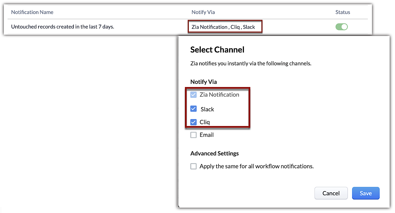Pe baza preferințelor tale, poți alege ce notificare va fi afișată pe ce canal. De exemplu, dacă vrei să fii la curent cu înregistrările neatinse din ultimele 7 zile, poți alege Slack sau Cliq, pe lângă panoul de notificări Zia, pentru a primi notificări instantanee.