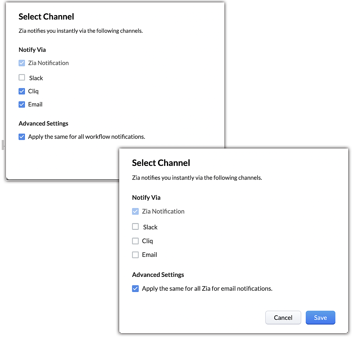 - În Advanced Settings, bifează caseta Apply the same for all workflow/ Zia for emails notifications, dacă dorești să primești toate notificările pe canalele selectate.