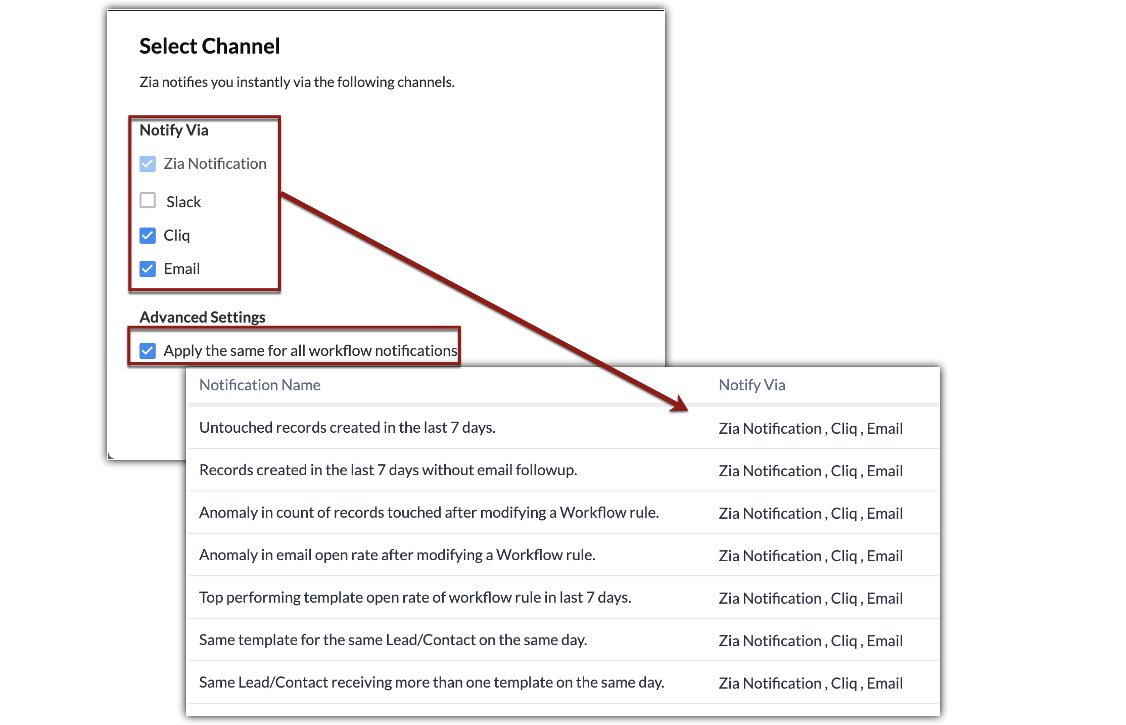 Poți aplica de asemenea aceleași canale pentru toate notificările din regulile de workflow și Zia for emails.