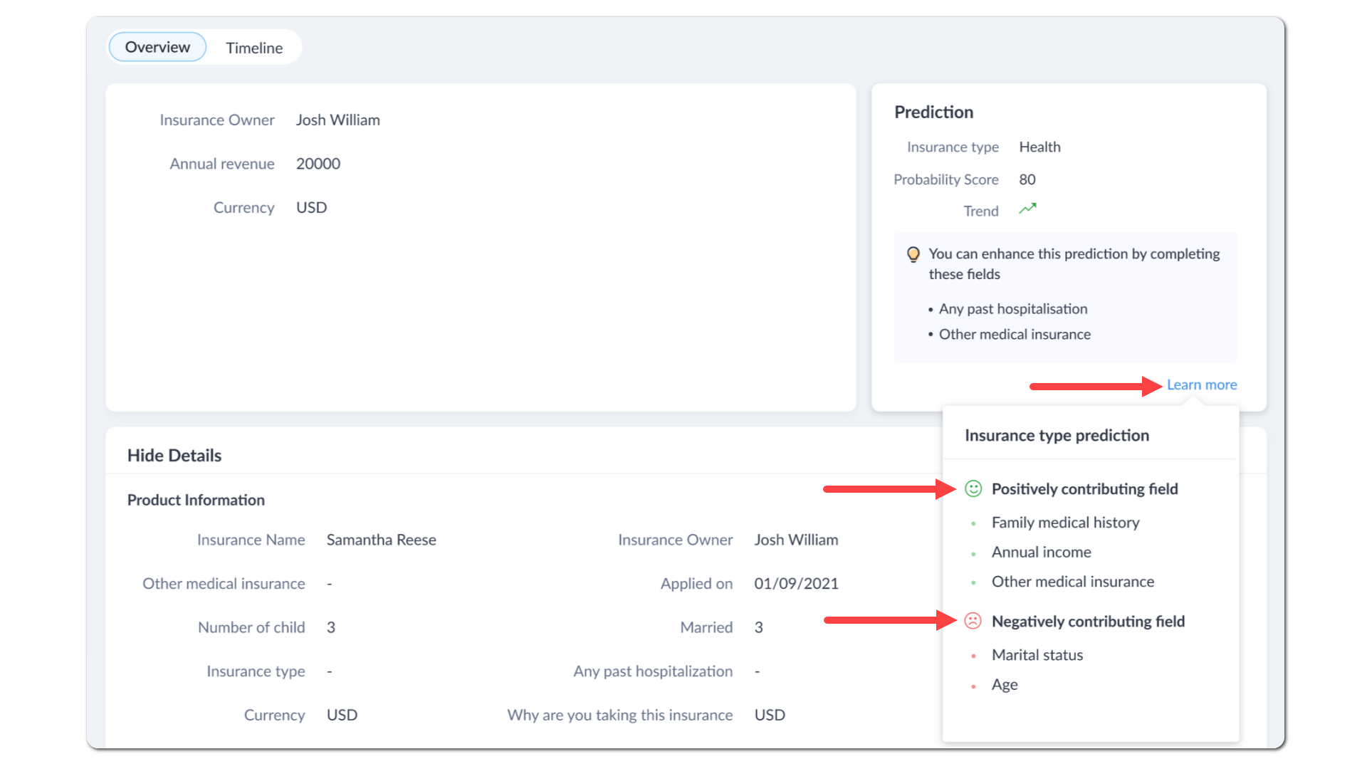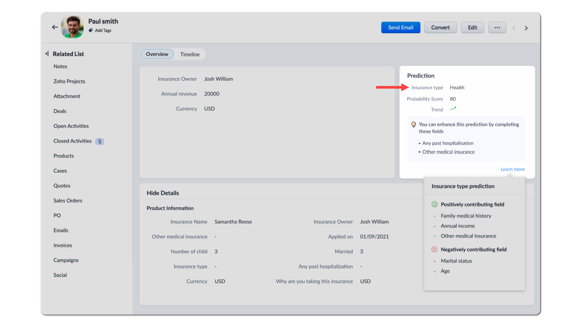 Predicția probabilității de achiziție a asigurării: Zylker oferă soluții de asigurare la prețuri competitive atât clienților locali, cât și celor internaționali. Baza lor de clienți este formată din afaceri mici și medii din diferite industrii. Deoarece cerințele fiecărui client sunt diferite, reprezentanții Zylker sunt încurajați să aibă discuții față în față, să viziteze birourile clienților, să împărtășească noi polițe și planuri și să efectueze sondaje pentru a afla mai multe despre nevoile lor. Pentru ca firma să-și atingă potențialul, vor să poată prezice:
