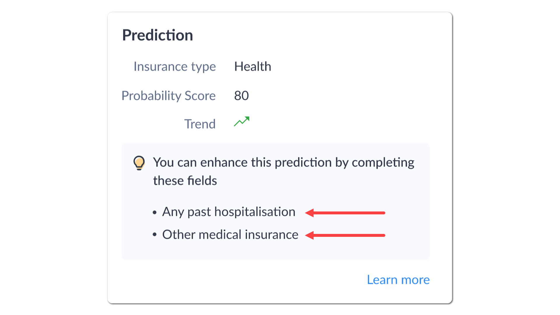 De exemplu, dacă istoricul medical al familiei, venitul anual, alte asigurări medicale, starea civilă sau vârsta au valori care vor ajuta Zia să facă predicția, atunci poți selecta aceste câmpuri ca date de învățare.