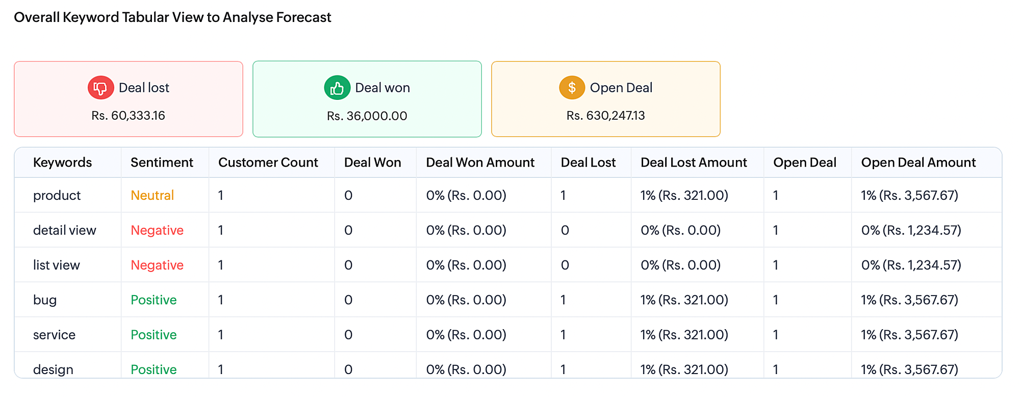Analiza previziunilor în VoC implică o analiză detaliată a tendințelor sau evenimentelor de vânzări trecute și prezente care prezic evenimentele viitoare. Pe baza acestei tehnici, Zoho CRM a elaborat o analiză bazată pe inteligență a cuvintelor cheie primite de la clienți prin diverse canale. Zia captează informații despre cele mai frecvente și recente cuvinte cheie rostite de clienți și intenția cu care au fost rostite aceste cuvinte cheie. Aceste informații, combinate cu multe alte funcționalități CRM, vor oferi tablouri de bord cu informații valoroase pentru clienți.