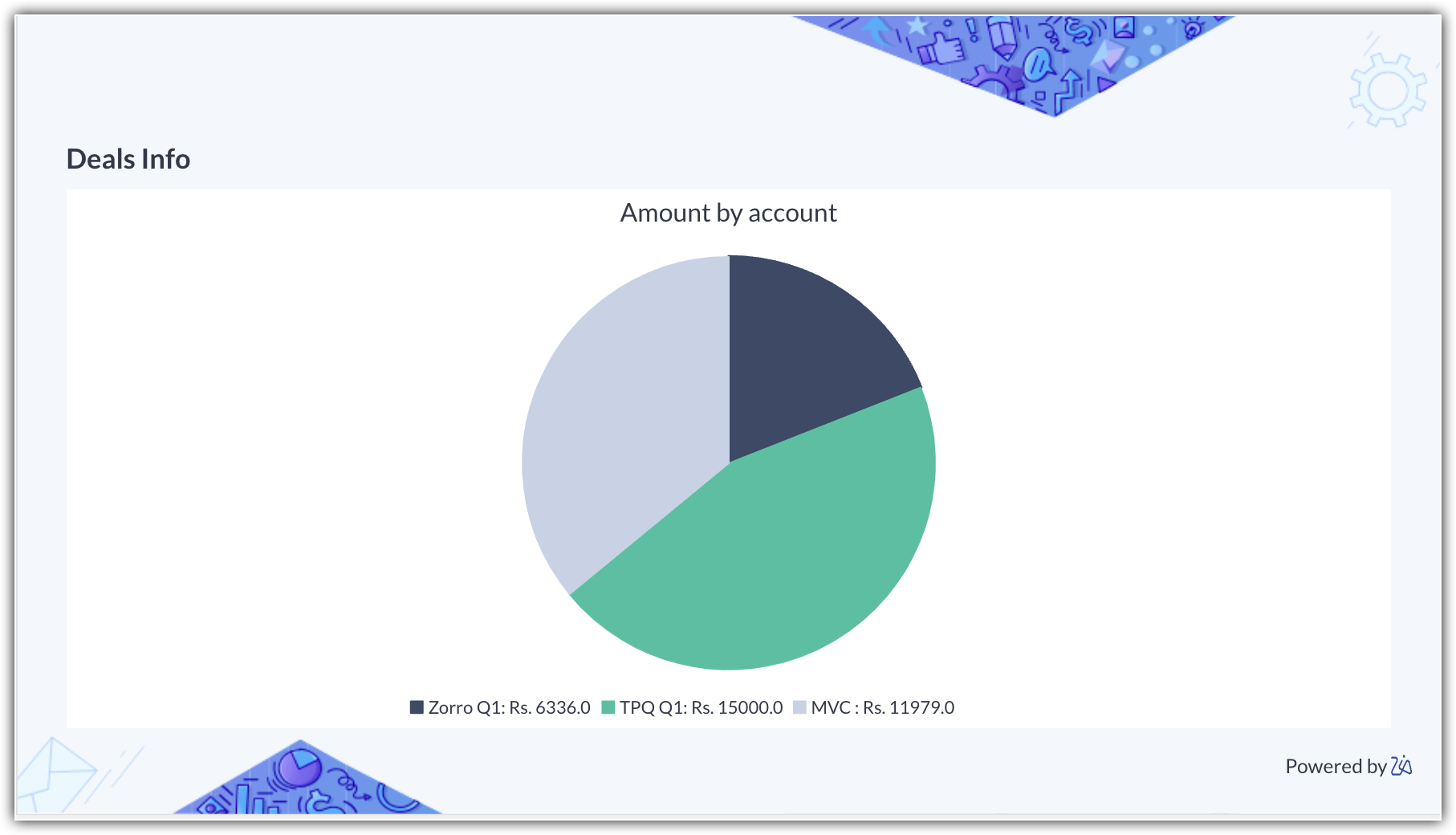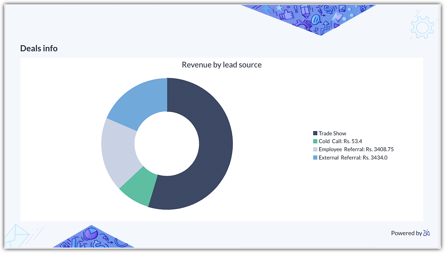 Pe lângă slide-ul de mai sus, Zia afișează și contribuțiile la venituri pe baza câmpurilor tale CRM sub formă de grafice de tip pie și donut.