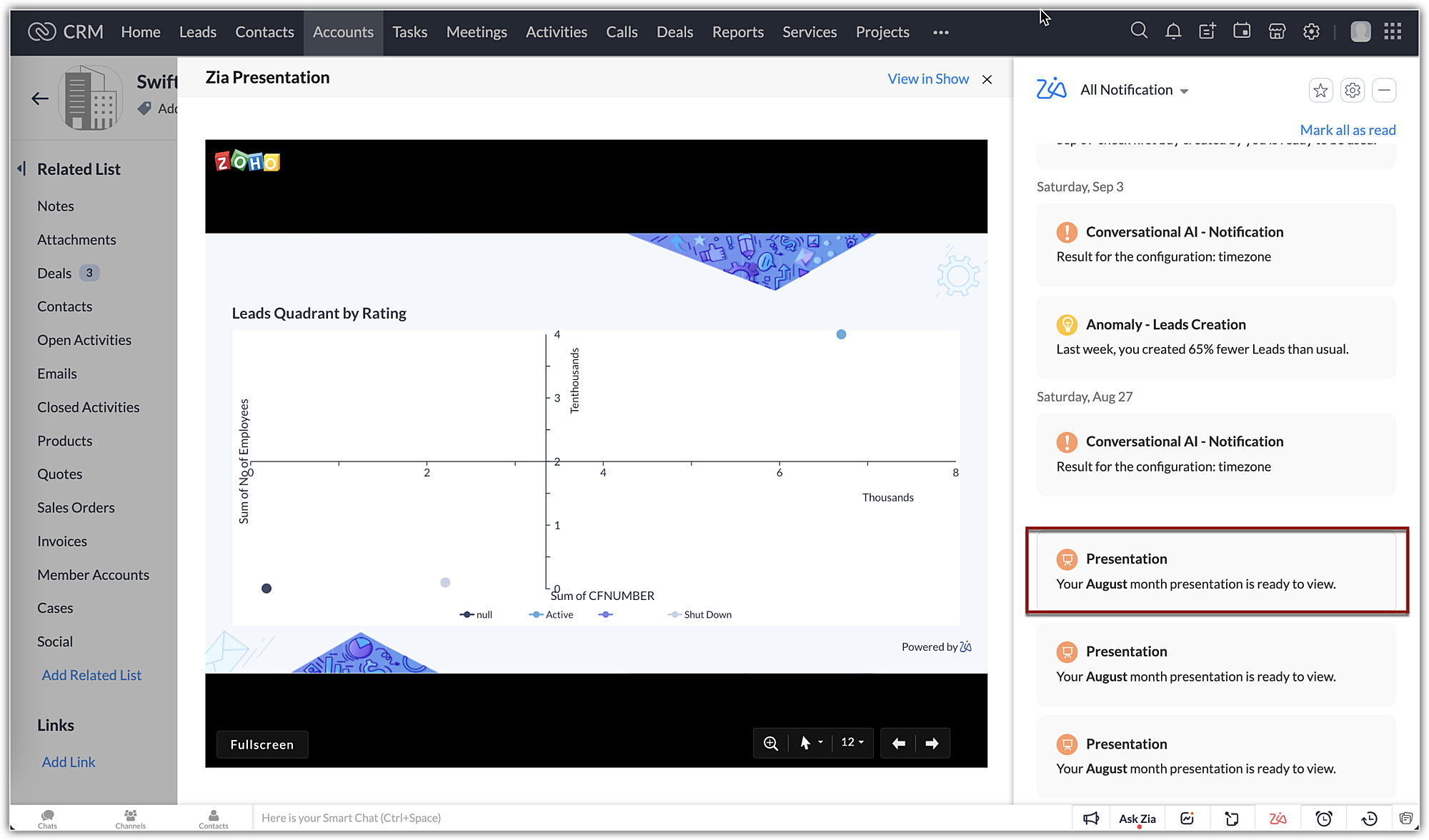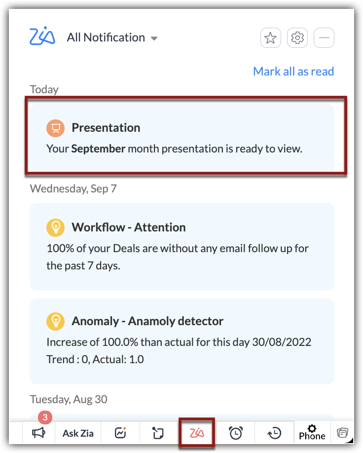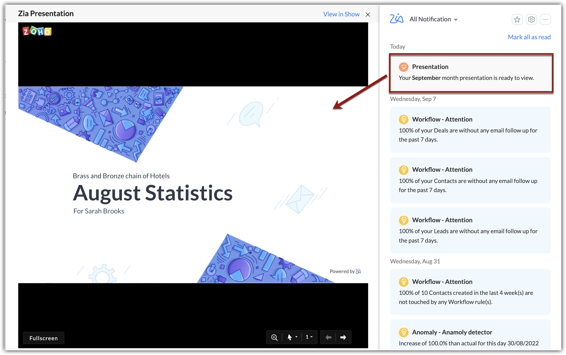 Pachetul de slide-uri pe care Zia îl pregătește este trimis ca notificare în panoul de Notificări Zia pe baza frecvenței configurate. În plus, dacă ai integrat Zoho Cliq cu organizația ta CRM, acesta va fi trimis utilizatorului selectat ca mesaj.