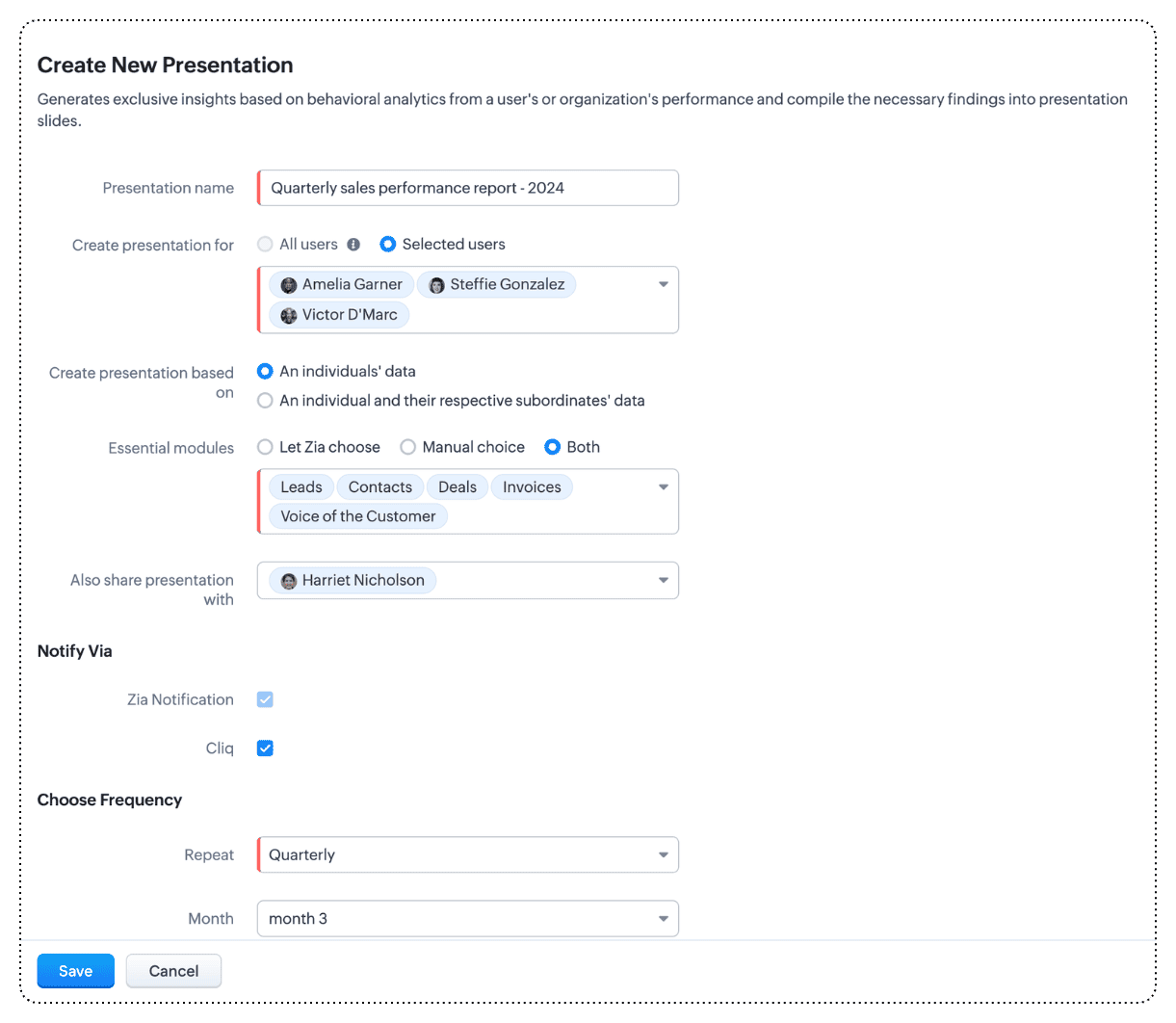Imaginează-ți, de exemplu, întâlnirea lunară de analiză a performanței de vânzări, în care organizația ta discută colectiv proiecții precum numărul de lead-uri generate, calificate și convertite, numărul de tranzacții câștigate, pierdute sau blocate, produsele cu cele mai bune performanțe și teritoriile cu cele mai slabe performanțe. Zia Presentations este util pentru recenziile recurente ca aceasta, care în mod normal necesită colectarea datelor cumulative de fiecare dată, economisind o cantitate substanțială de timp și efort.