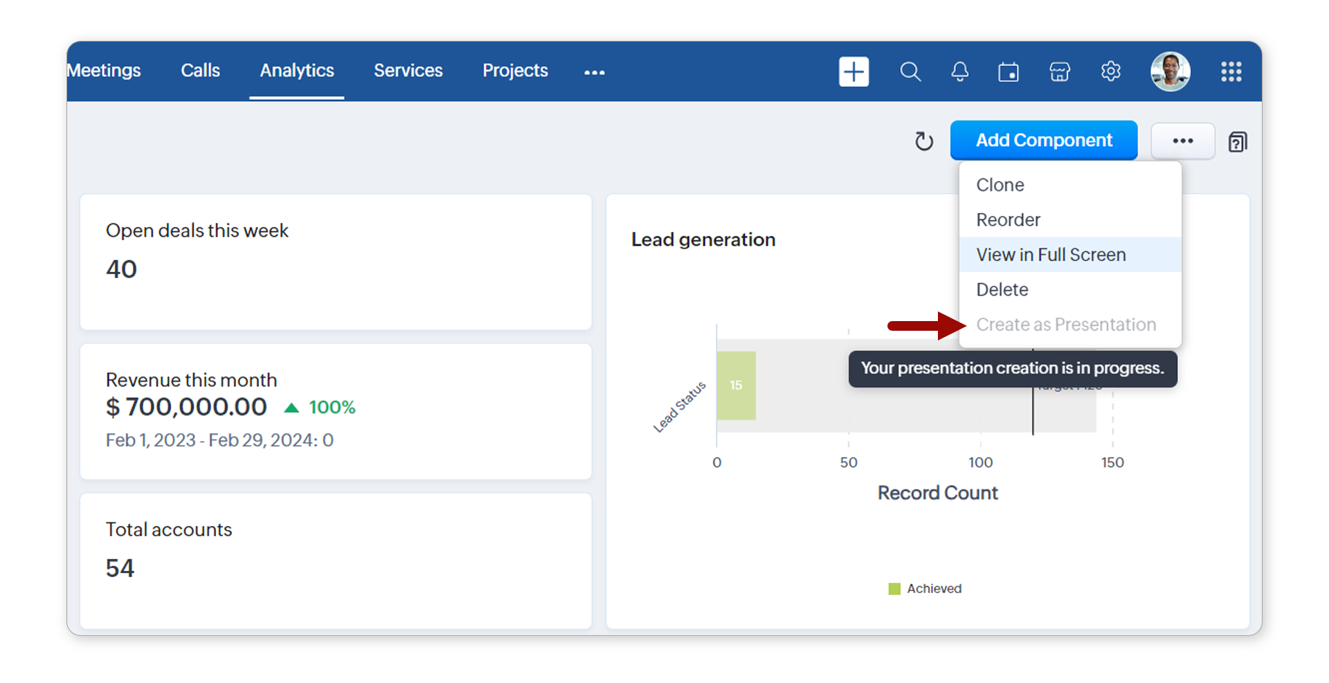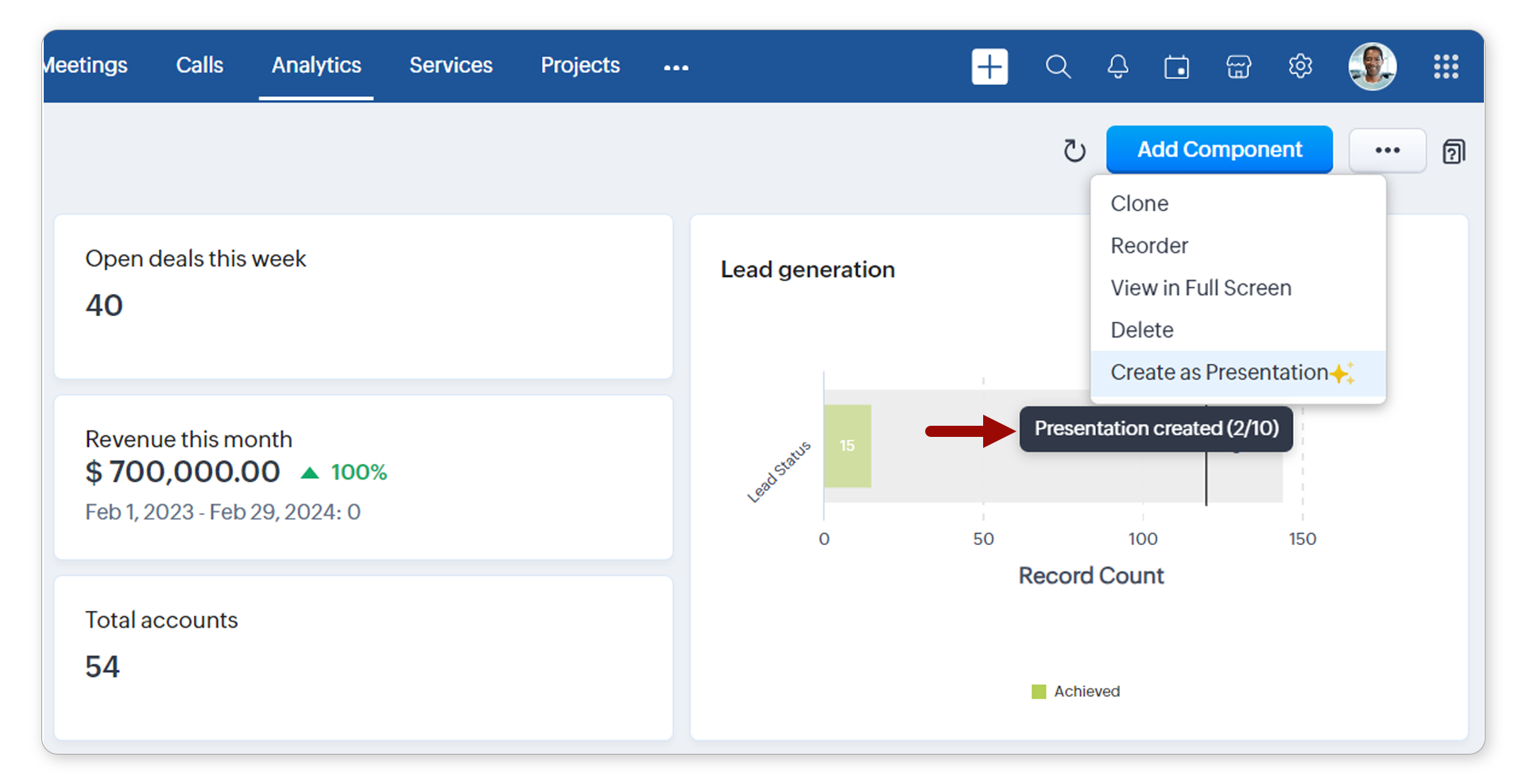Poți converti rapid un dashboard într-o prezentare și o poți folosi în întâlnirile de echipă, sesiunile de strategie, evaluările de performanță și altele. Poți începe să prezinți noul pachet de slide-uri direct din CRM-ul tău. Dacă dorești să faci modificări, poți deschide cu ușurință pachetul de slide-uri în Zoho Show. Modificările făcute acolo vor fi sincronizate înapoi în pachetul de slide-uri din CRM-ul tău.