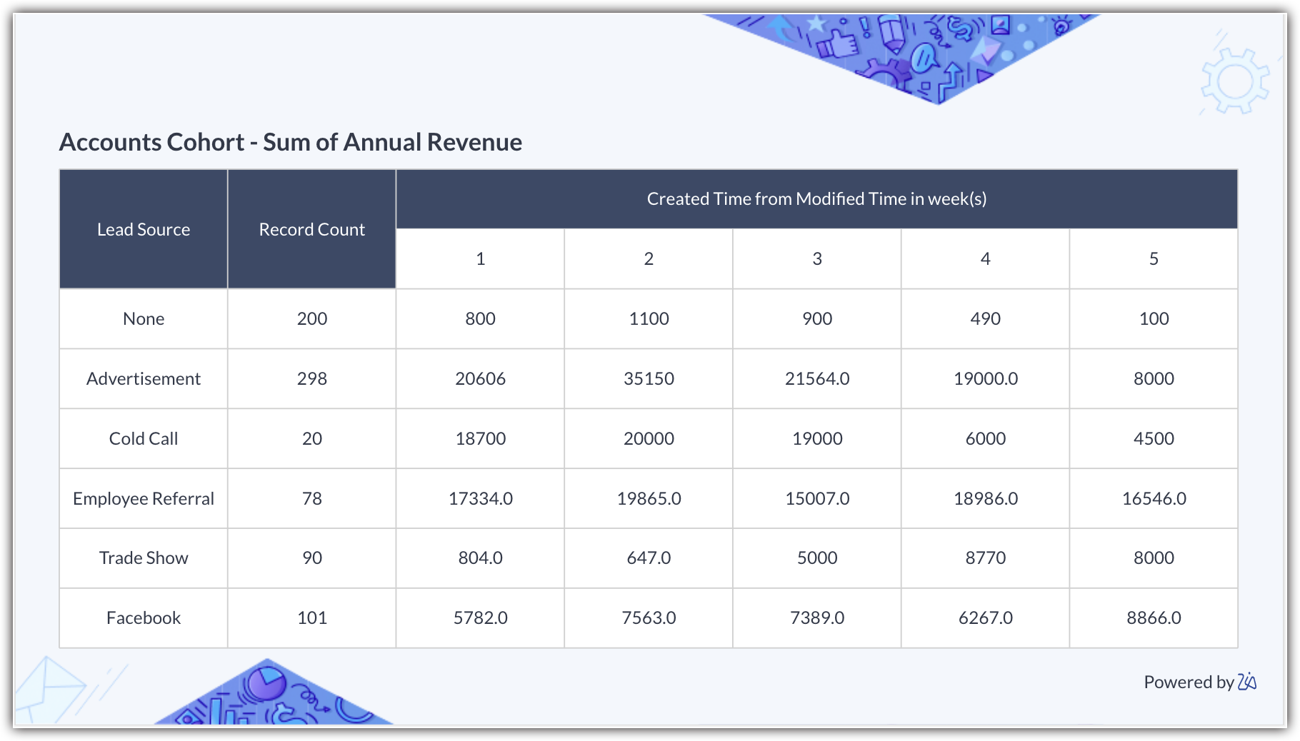 Un grafic de cohortă este un instrument util pentru a înțelege un comportament sau o tendință în organizația ta CRM. Arată cum performează un anumit punct de date în timp.