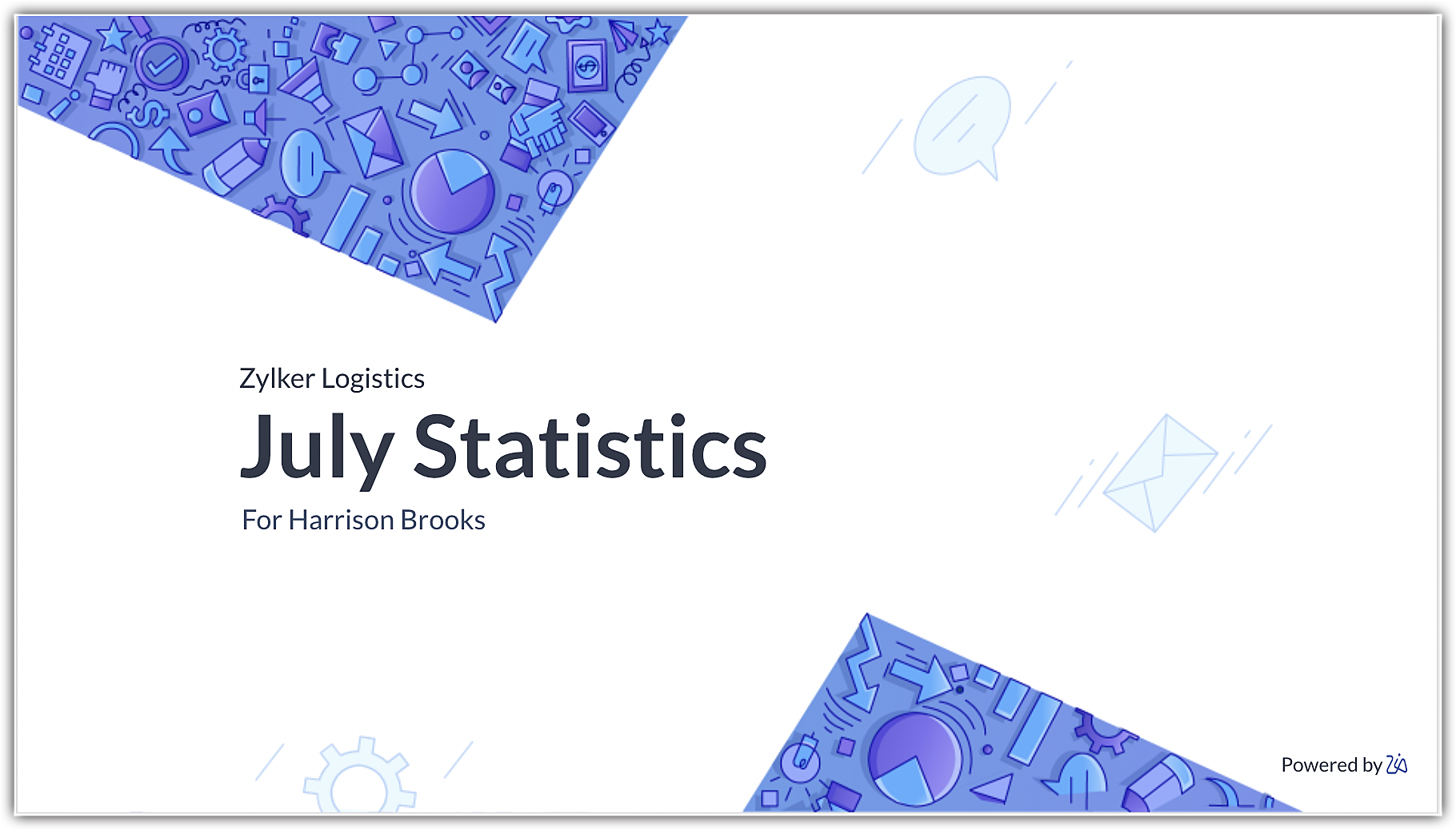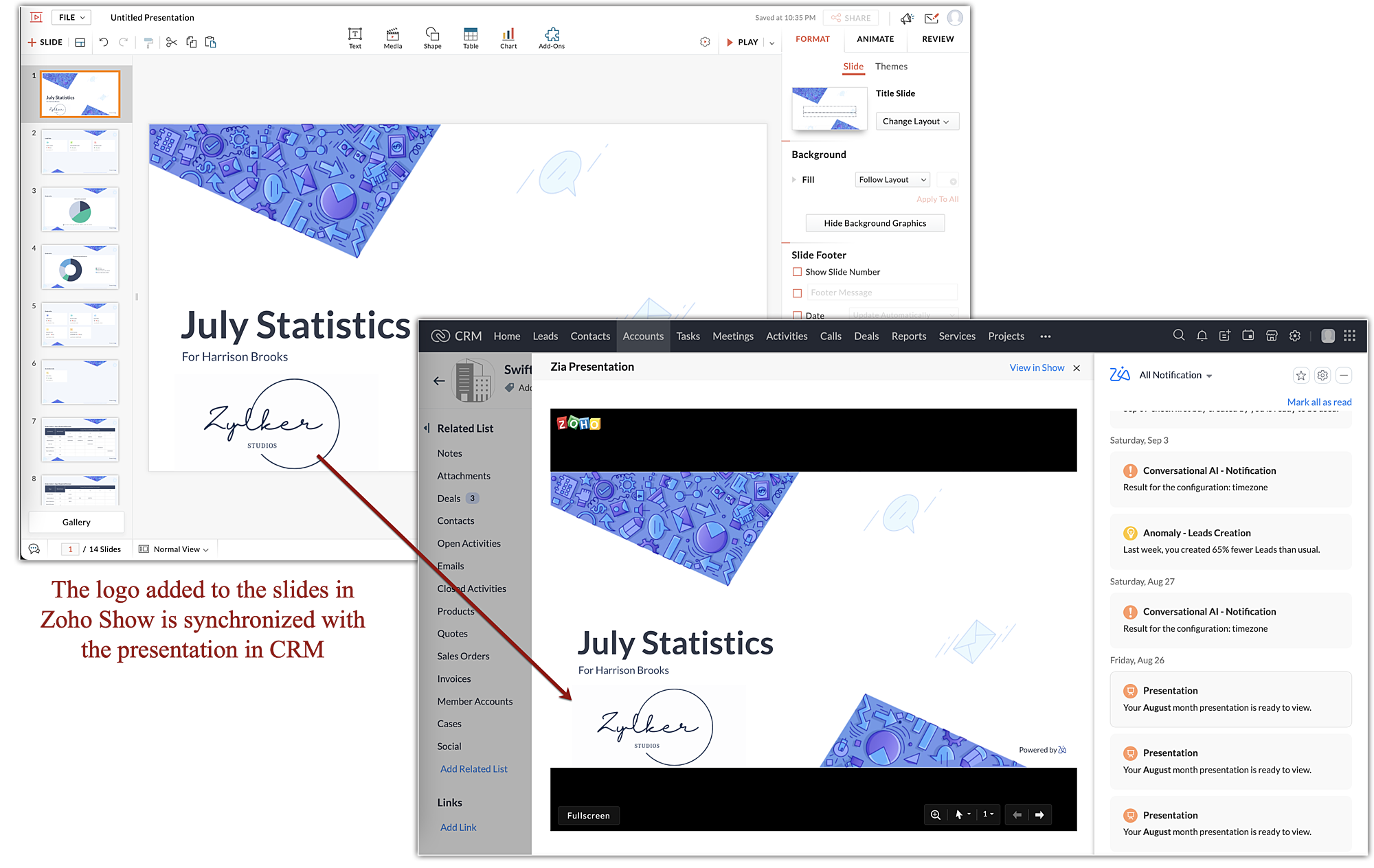 Slide-urile Zia pot fi exportate și vizualizate în Zoho Show, unde poți adăuga un logo, schimba tema, edita reprezentarea datelor și altele. Modificările făcute slide-urilor în Zoho Show vor fi sincronizate cu prezentarea din Zoho CRM.