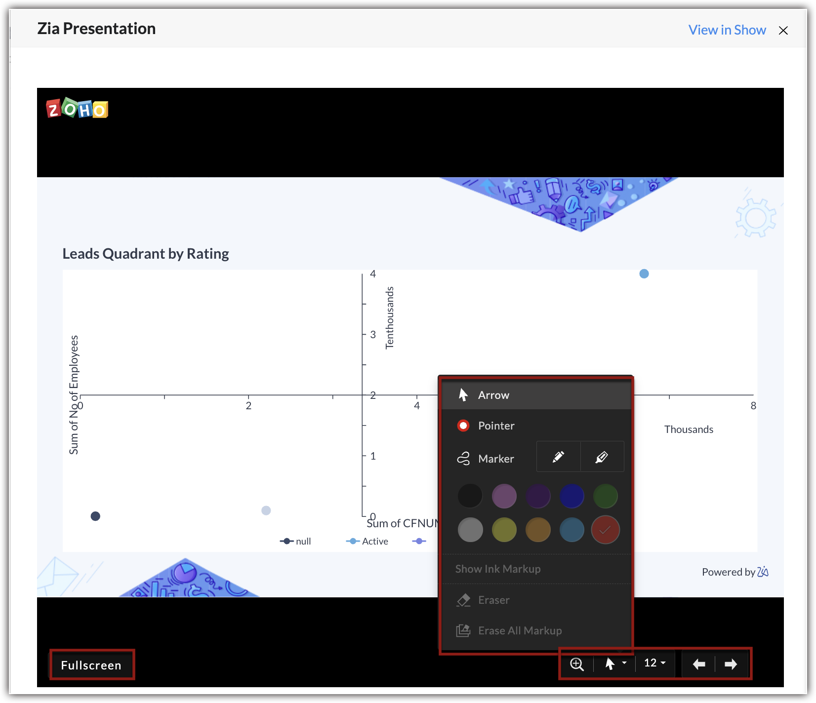 - Comută opțiunile de prezentare (Ecran complet, zoom, pointer, navigator de pagini) din partea de jos a slide-ului pentru a prezenta slide-urile din Zoho CRM.
