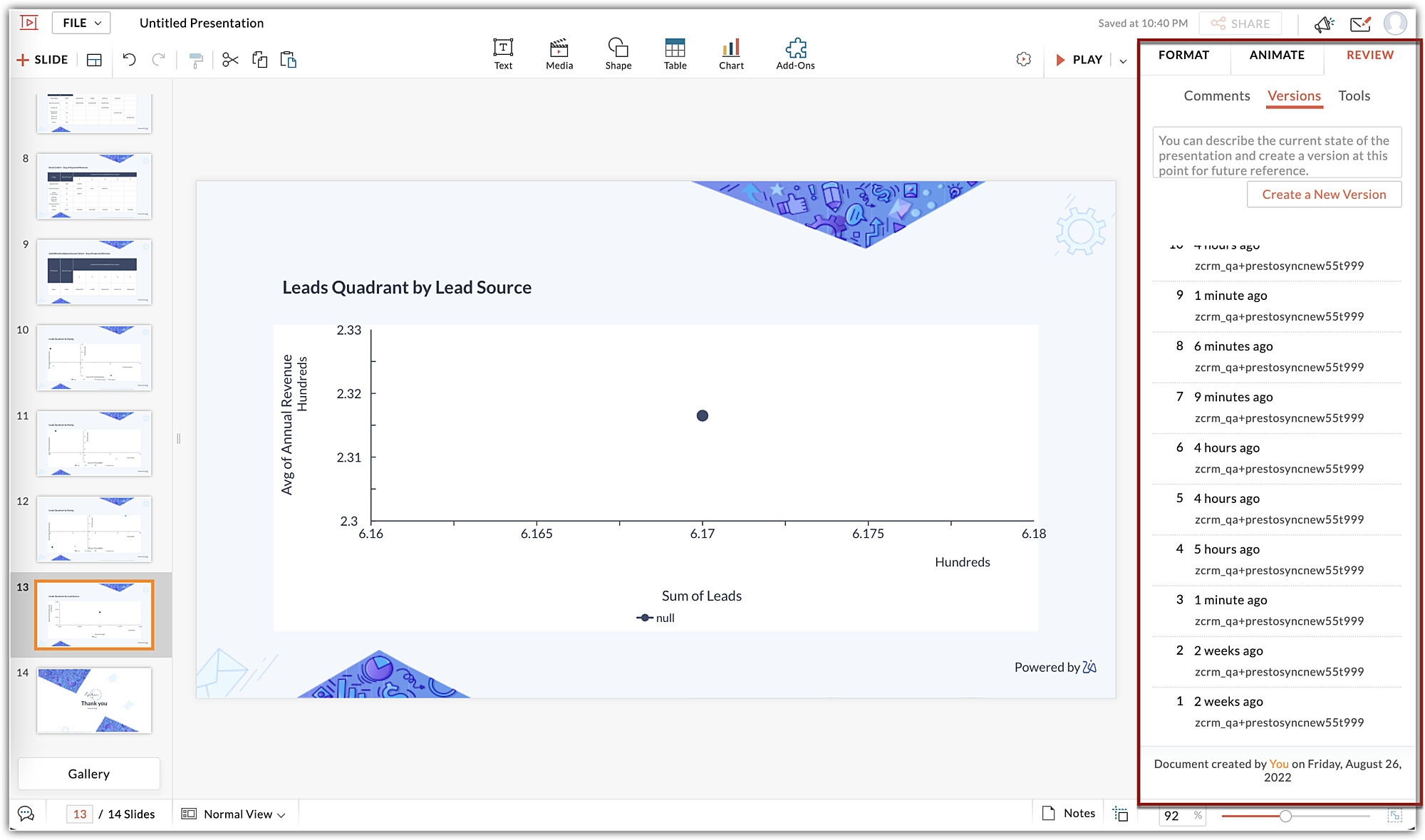 Datele prezentate în prezentări sunt date în timp real din contul tău Zoho CRM. Orice modificări făcute slide-urilor după exportul în Zoho Show vor fi sincronizate cu slide-urile din Zoho CRM. Poți totuși gestiona sau revizui versiunile accesând Versions din tab-ul Review al prezentării. Apasă aici pentru a afla mai multe.