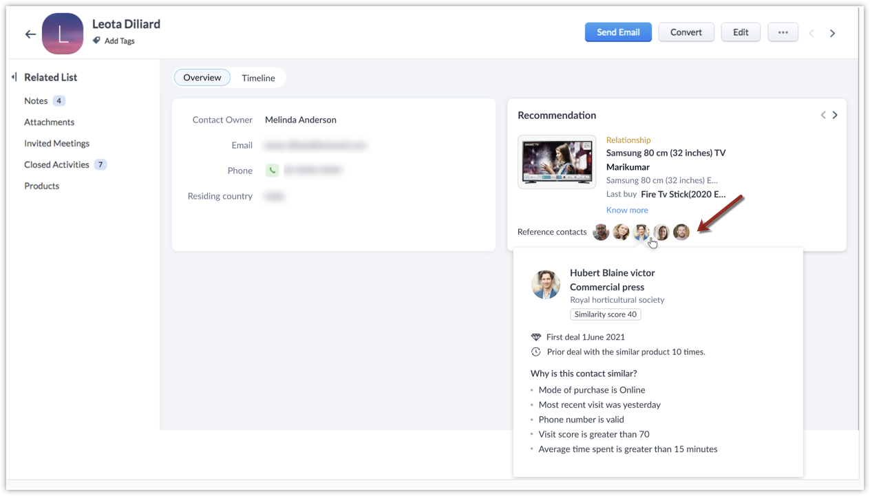 - Lista factorilor care au fost luați în considerare pentru a identifica similaritățile. De exemplu, Hubert este un contact de referință pentru Leota deoarece modul lor de achiziție este online, vizita recentă a fost ieri pentru ambii, locația geografică și altele.