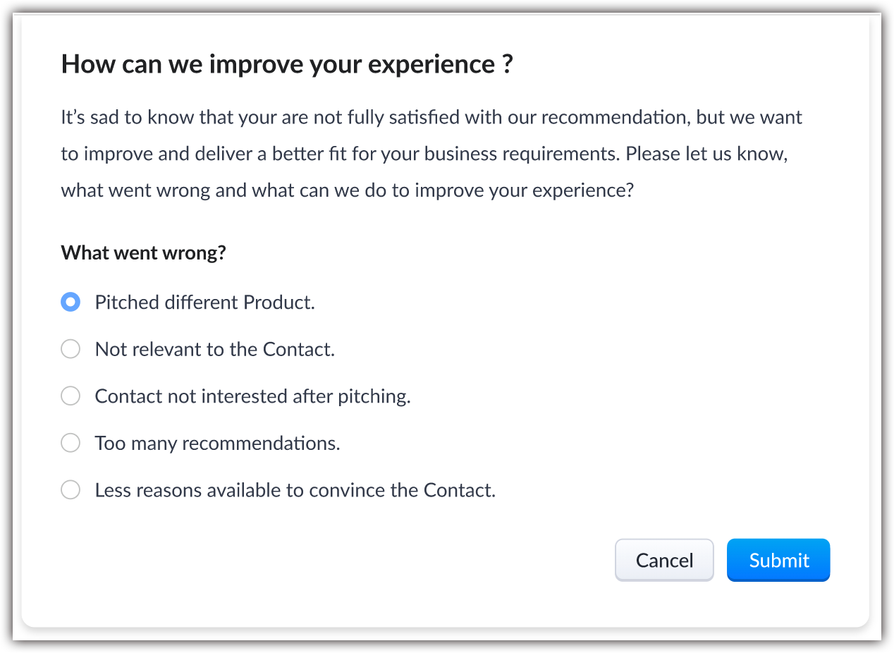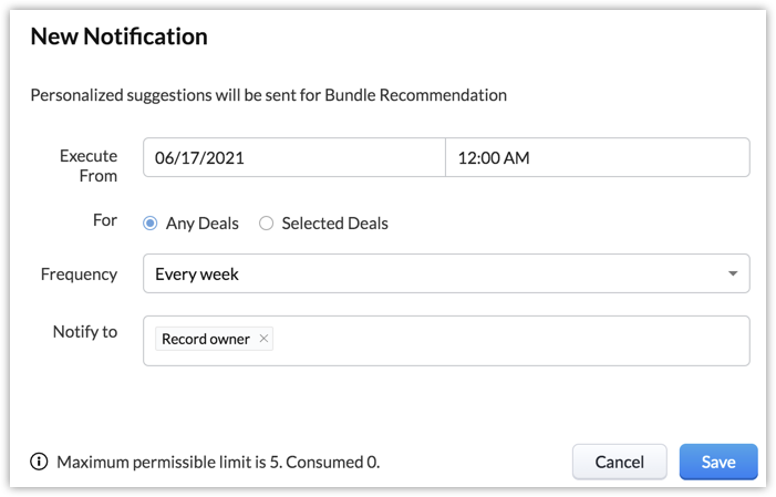 - Recomandările care sunt afișate pentru un produs sau o tranzacție care este deja achiziționată sau asociată cu contactul, sunt aplicabile pentru Workflow. Adică, dacă contactul a achiziționat un laptop, atunci Zia va recomanda din nou același produs; pentru această recomandare poți crea un workflow.